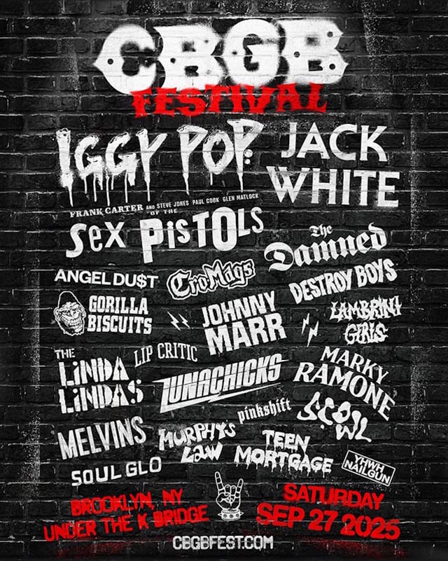 The CBGB Festival is set for September 27, 2025, at Under the K Bridge Park in Brooklyn, NY. Presented by The Bowery Presents, the one-day event will feature twenty-one bands across three stages. Iggy Pop will headline the festival with his first NYC performance in over a decade, alongside Jack White. The festival pays tribute to the legacy of CBGB & OMFUG. Tickets are available at this location.