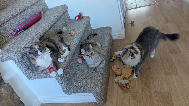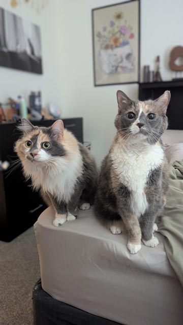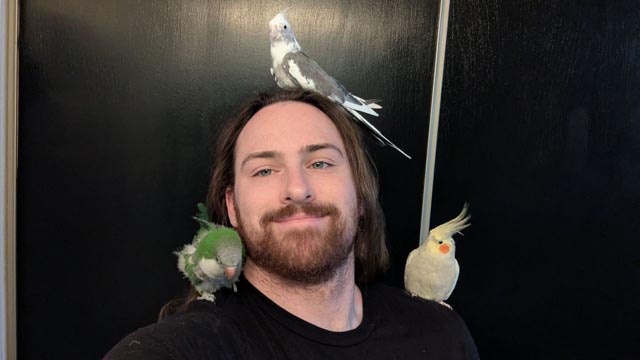 In total I’ve got 3 cats and 5 parrots. Cat #1 is Piper, a chubby dilute calico who loves cheese and long naps on the couch. Then there’s Shira, a loud Point Lynx Siamese who purrs the more you annoy her. Alma is the baby of the trio, a fluffy dilute calico that doesn’t know how to sit still. My parrots are named Ziggy, Agnes, Gertrude, Ingrid, and Eugene. They’re all cute and dumb. Eugene is my special little guy though, he gives kisses and plays peak-a-boo.