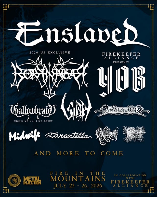 Fire in the Mountains will return to Red Eagle Campground in East Glacier, Montana, from July 23–26, 2026. The first wave of bands have been revealed, with headliners still to be announced. Enslaved will make their long-awaited return, while Borknagar will perform an exclusive U.S. set. The festival will also host Yob, Gallowbraid (U.S. live debut), Sigh, Wayfarer, Midwife, Tarantella, Galvanist, and Nocturne. Tickets, VIP packages, and camping options are on sale now. For more information on the festival, go to the event’s website.