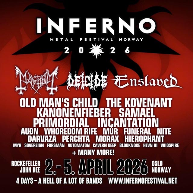 Inferno Metal Festival has announced its third wave of bands for the 2026 edition, adding Mayhem, Primordial, Funeral, Múr, Nite, Hierophant, Sovereign, Blodknoke, Cavern Deep, Voidspire, Automaton, and Hevn III. The festival returns to Oslo, Norway, from April 2–5, 2026. Tickets are available at this location.