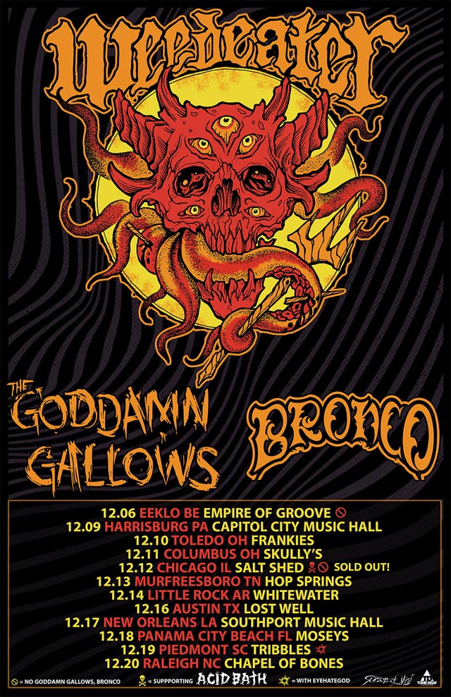 Weedeater have announced their final set of shows for 2025, with a December headlining tour. Support will come from Goddamn Gallows and Bronco. Along the trek, Weadeater will join Acid Bath and High on Fire for the Chicago show, followed by a South Carolina show with Eyehategod. Tickets are available at this location.