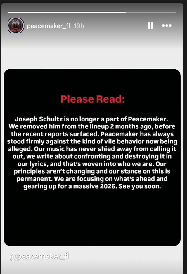 “Joseph Schultz is no longer a part of Peacemaker. We removed him from the lineup 2 months ago, before the recent reports surfaced. Peacemaker has always stood firmly against the kind of vile behavior now being alleged. Our music has never shied away from calling it out, we write about confronting and destroying it in our lyrics, and that’s woven into who we are. Our principles aren’t changing and our stance on this is permanent. We are focusing on what’s ahead and gearing up for a massive 2026. See you soon.”