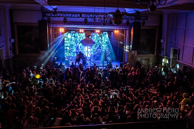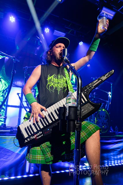 Aqua jetting onto the stage at 9:00, the five pirates of power metal’s dark waters took the pumped up congregation for a near two-hour adventure on the SS Aqua-Duck – a voyage on the cemented high seas of Brooklyn as Alestom hoisted the mizzen with the bouncy opener in Keelhauled. The rum, beer, and some mead flowed; the liquidation of crowd-surfing increased as Alestorm celebrated their eighteen-year musical odyssey with the release of their eighth studio album, The Thunderfist Chronicles. Alestorm’s return to New York saw the freebooting quartet clamping down their jaunty sound to an even more splashing live territory. Over the 115-minute Brooklyn takeover, the five sea dogs took charge of Warsaw faster than the ghostly pirate, Captain LeChuck from Monkey Island. Nineteen songs showcase the band’s folky and ready-for-a-quest sound, keeping the carousing night going with the raw, alcohol-fueled energy of early arias like Mexico, the distinctive eponymous tune, and sparkling new tracks such as Killed to Death by Piracy and The Storm. Nevertheless, Alestorm kept the dance floor afire with one sparksurfer after another as in Frozen Piss 2, the Taio Cruz cover of Hangover, and P.A.R.T.Y. barreled through the waves of crowd-surfers.