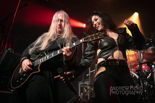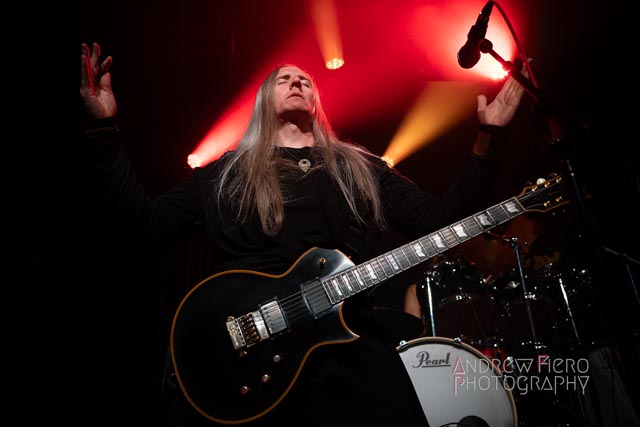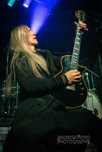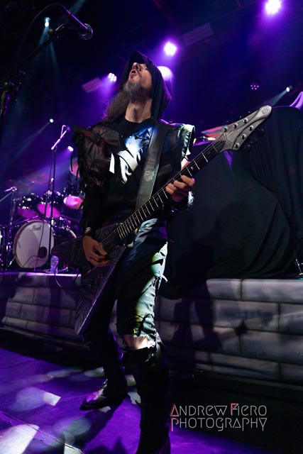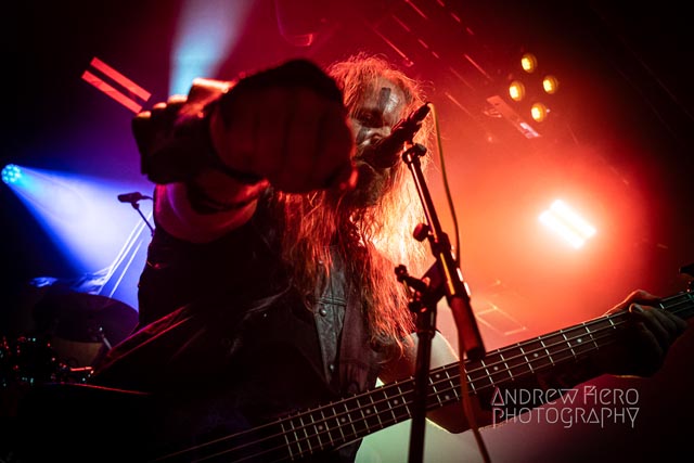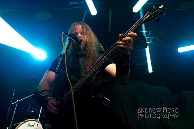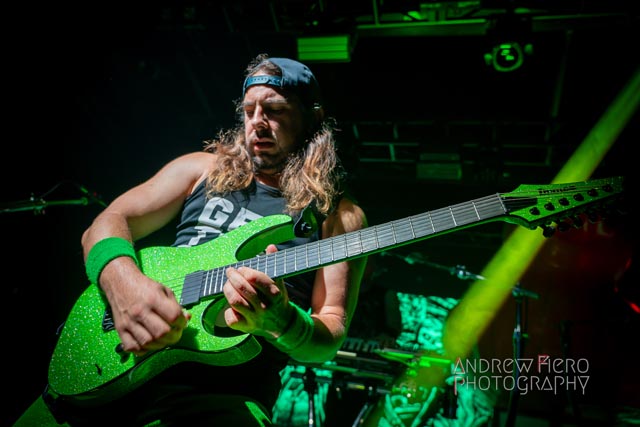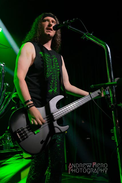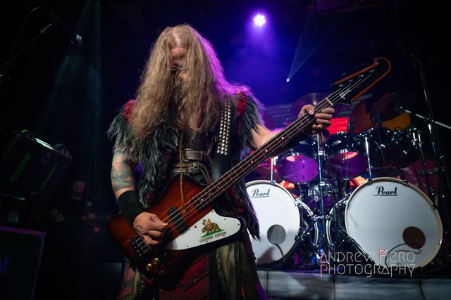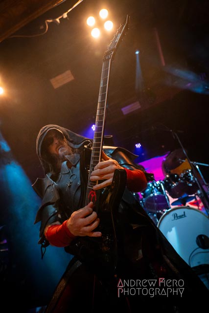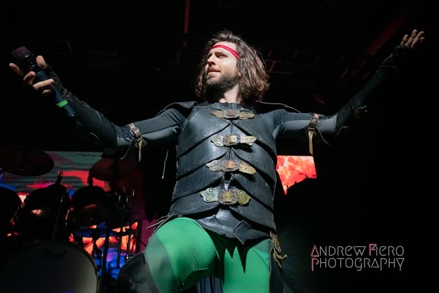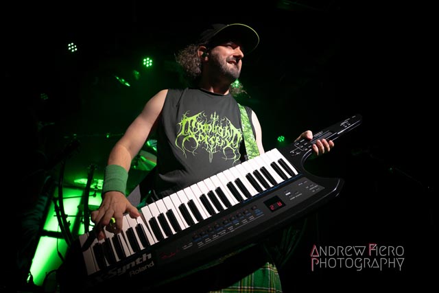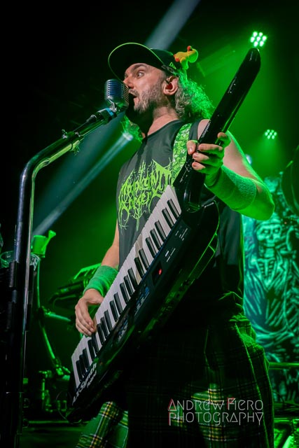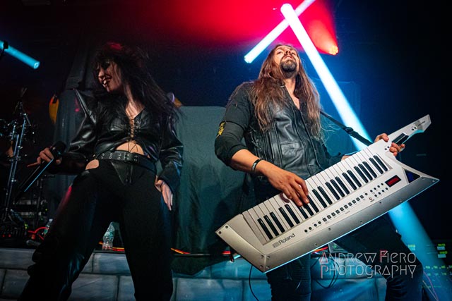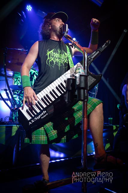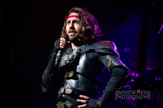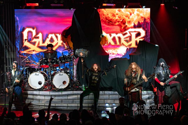 Fueled by storytelling ambition and a roaring disdain for dragons, Glyph stays true to their style by blending scaling vocals from their new vocalist, Barbara Blackthorne, and raging keytar licks from Jeff Black. Built on bouncing melodies, Battle Beast-like infectious hooks, and flashes of soulblazing, high-energy metal, made them a true mishmash to get the rager of unrelenting heaviness started at 7:00. Glyph is a meteor-sized example of both the devastation and ion pulse that a third-billed band for a power metal three-way archdemon touring package should be known for. Although their set was thirty minutes long, Glyph’s time on stage resulted in raw intensity with a twisting sense of precision from guitarist and Rob Steinway, bassist Darin Wall, and drummer Damien Rainaud winning over a squad of new fans. Their six-song set list mainly highlights Honor. Power. Glory—offered a core representation of the soaring type of unmistakable heavy music that Glyph showed off to the New York Legions of the United States of America — a sound that made us want to bang our fists in the air and headbang all at once from A Storm of Crimson Fire from Honor. Power. Glory and new songs like Rune Master. Barbara Blackthorne would appear once more in a few hours to assist on vocals with the mean, green, lovable Larry’s in a kilt and pants. Glyph won our hearts with every anthemic, blessedly shreddy earworm. And after you started your bar tab with some spirits, do your best to show up early to see Glyph. Their set was fun. The band powered up the audience for some Gloryhammer-style heavy fucking metal.