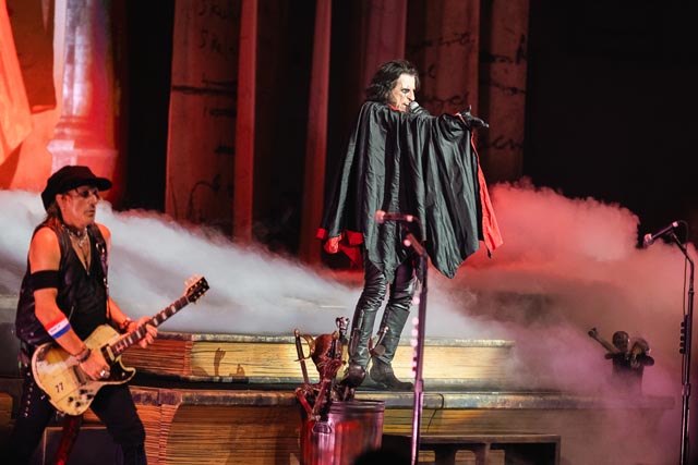 Alice explores familiar melodramatic territory, offering a soul-stealing spin from his most popular stunt, yet still grounded in the intensity and skit-driven showmanship he is known for, the moment arrived for the set’s literal centerpiece from the guillotine where the diabolical strigoi got his head got seemingly chopped off by his wife Cheryl Cooper, enveloped by two more, albeit shortened versions of a handful of blood diamonds in Second Coming and Going Home, before sending his devotees home with the grand finale, his highest charting single ever, School’s Out, complete with a snippet of Pink Flyod’s Another Brick in the Wall, Pt. 2 and band introductions, plus fittingly having Dennis Dunaway on stage again to join in on a perfect ending to this Alice Cooper show. Remember the Coop, indeed!
