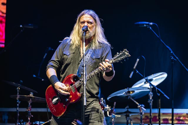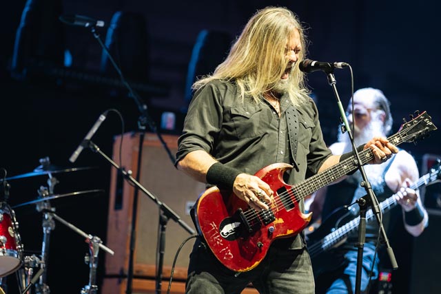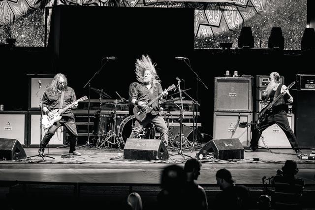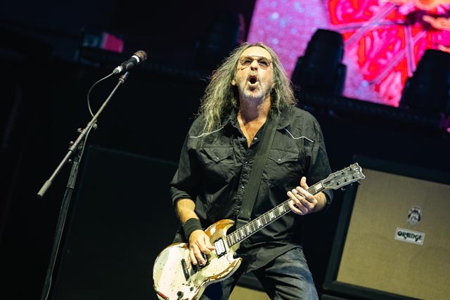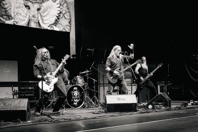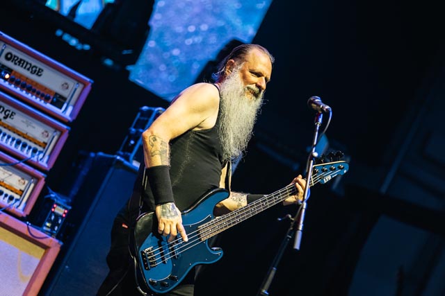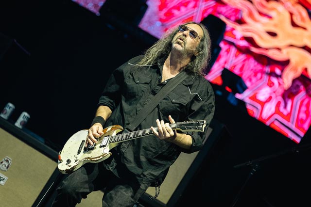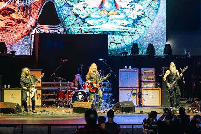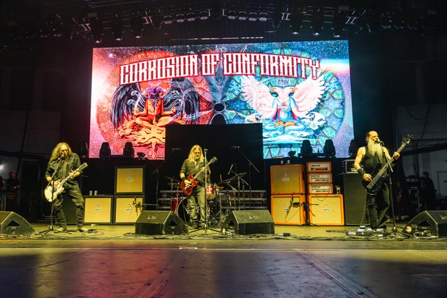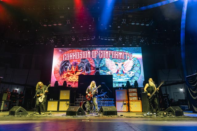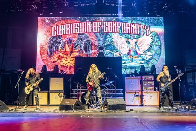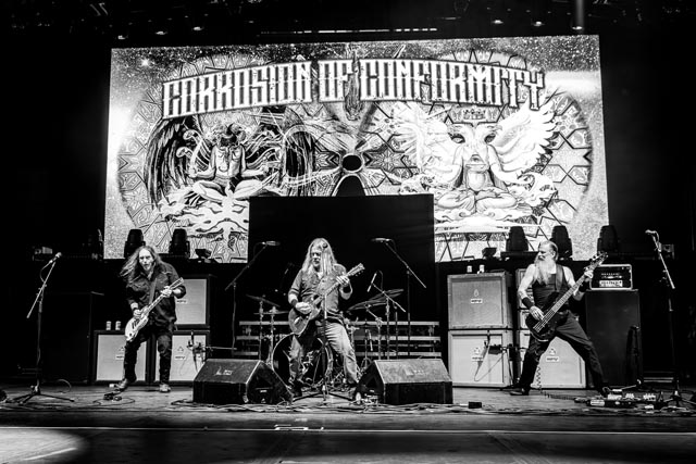 Corrosion of Conformity assured a special evening celebrating the integral connection between music and the life and works of two icons – featuring Iommi-inspired riffs by Pepper Keenan live and in-person with his brother in grungy music, one of doom metal’s greatest living lead players named Woody Weatherman, and two of C.o.C’s closest confidants, Bobby Landgraf on bass and Jason Patterson, the man holding down the pocket on this tour in place of Stanton Moore. As openers, we, as a clique who showed up early, reveled in the muddy, spicy, punky bliss over just how much exceptional hardcore-meets-metal Corrosion of Conformity has manifested with a thirty-minute long set, and how lucky they must have felt to tour with two figures of heavy metal. So, when we sat down to see this band properly during their opening slot, the amphitheater was already filled with their devoted fans by 6:25 p.m., and our expectations were through the roof. You have to show up early to see them power tripping on Wiseblood, Vote with a Bullet, not to forget their two snarling hits in Albatross and Clean My Wounds.
