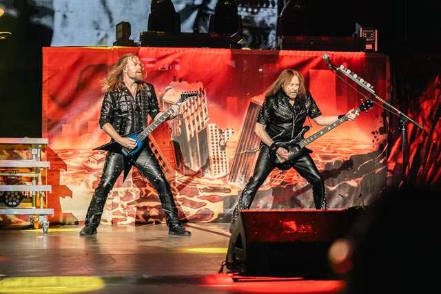The band is continuing the searing, shifting, and incredible metal burst by digging deeper into the group’s rich and razor-sharp live experiences. Having already mentioned the furious drum talents of Scott Travis, the drifting harmonies and the overdriving leads from some fresher blood with Richie Faulkner and Andy Sneap is still present, a terrific duo doing a magnetic job holding down the spots once filled by the behemoth-sounding guitar duality of KK Downing and Glen Tipton, where an O.G. named Ian Hill culling buzzing bass lines to maintain his aura in the background while keeping the live voltage risen. Glen Tipton is no longer in the band due to battling Parkinson’s disease, but he remains a member of the Judas Priest family. I’m sure that Glen was cheering them on from the sidelines. There is also the matured-pipes of the metal god, Rob Halford, where line delivery at his younger seventies from becoming an operatic barritone which is still going strong and can still anchor down the high notes when the song gears up for it, especially for the Painkiller selection of songs, by and large for the title cut all punched-up as the centerpiece of the album’s celebration, steamrolling the throng of metallians. But that barely covers the performance, teamwork, and utmost professionalism Judas Priest presents in a modern arena setting.