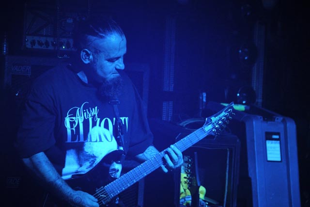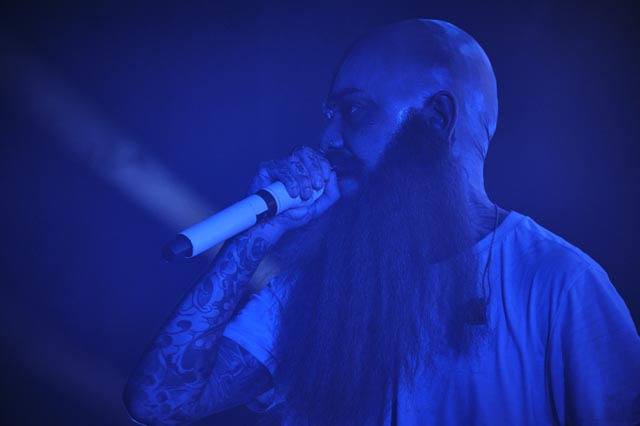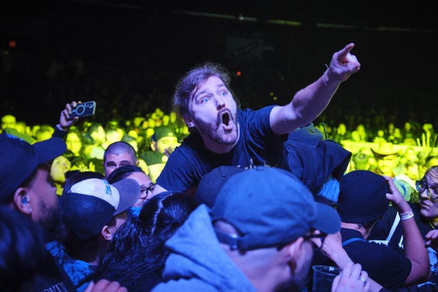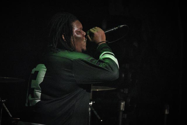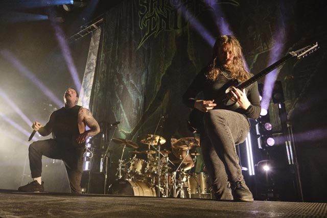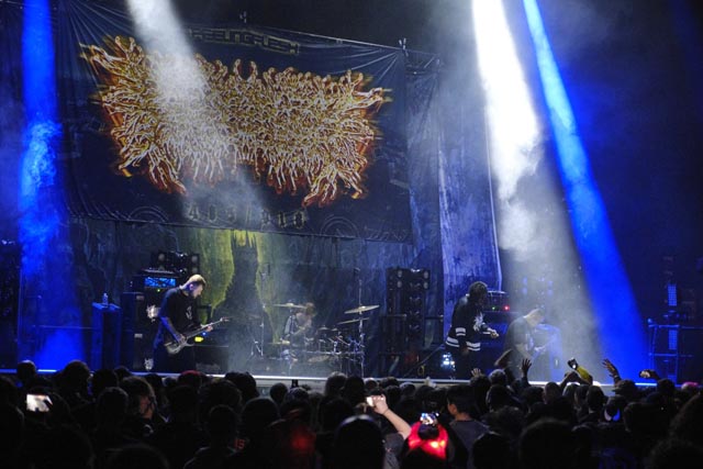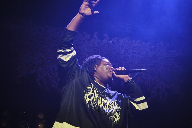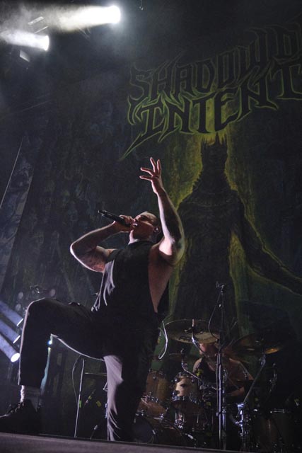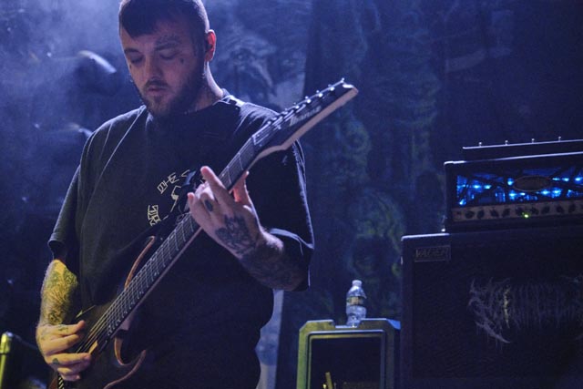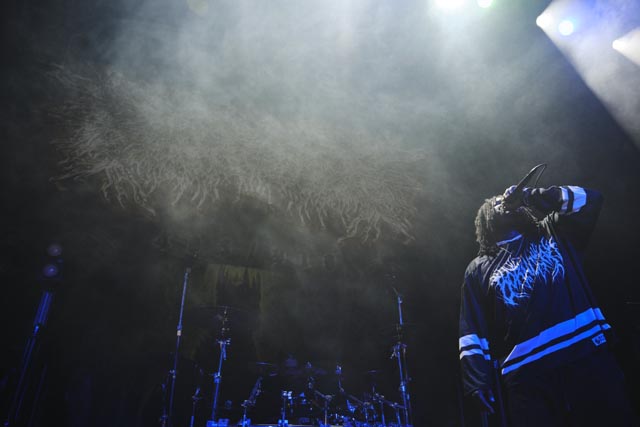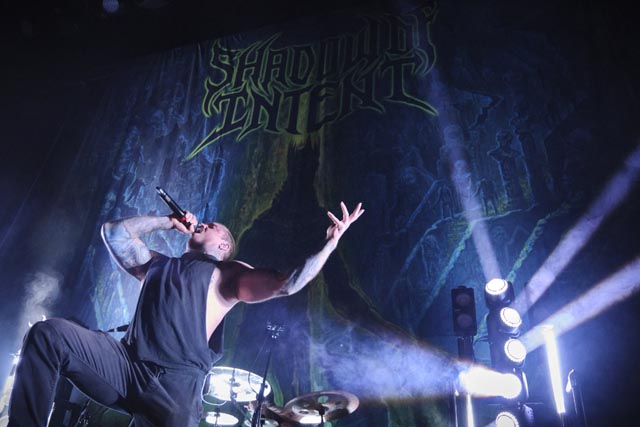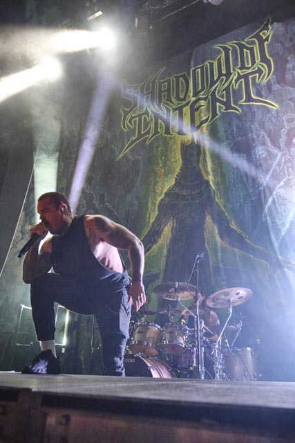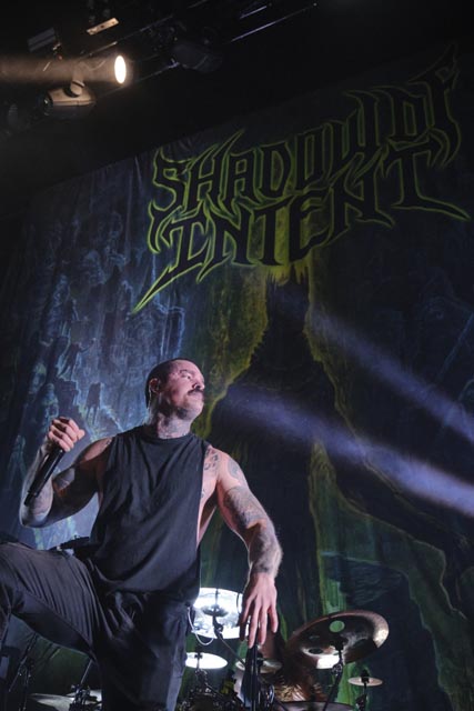 Here comes the bare bones brutality. Peeling Flesh was first up to chip away a night of chills and thrills with a half-hour of booming music. And the Oklahoma crew came to party: the throng that showed up early discovered what is objectively full tilt aggression and groove-rooted retaliation as soon as the band locked-down upon MSG, on the razor sharp opener of 12 Gauge Autopsy to blatantly send their roaring fans on the floor into the skin shaving winds of the pit, as Scooby Doo, Kenny from South Park, and other psyched up two-steppers crashed along with the punishing tunes, and, manifestly, showed the onlookers, proud chaos, captured by distinguished lineup of their roaring vocalist named Damonteal Harris alongside the dual axe attack of Jason Parrish and Mychal Soto. Joe Pelleter held down the rhythmic guillotine on the drums to split the skulls of the audience on songs like DVPB and Midnight. These four fresh faces of modern barbarity are experts at conjuring primal explosions and growling distortion—a sound defined in the blueprint of old-school death metal by Internal Bleeding, who brought the term “slam” to a worldwide fanbase in 1992, and further lionized by Peeling Flesh. Crushing the crowd one more time side by side with F.F.W.A.S., they wouldn’t do it anywhere else to assist in rounding out the end of the tour, other than at MSG. Slammy-slams-slams all around from Peeling Flesh to energize the stage for Shadow of Intent to contribute to our shattered eardrums.
