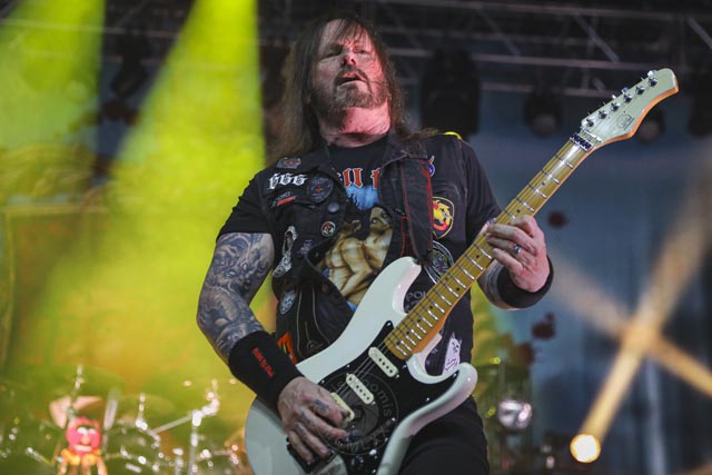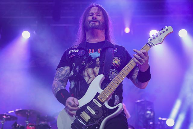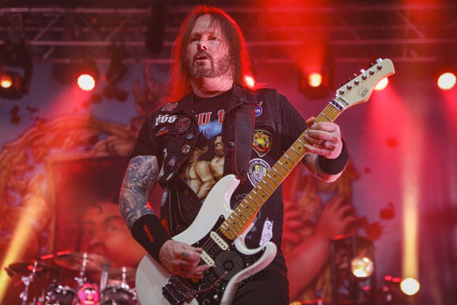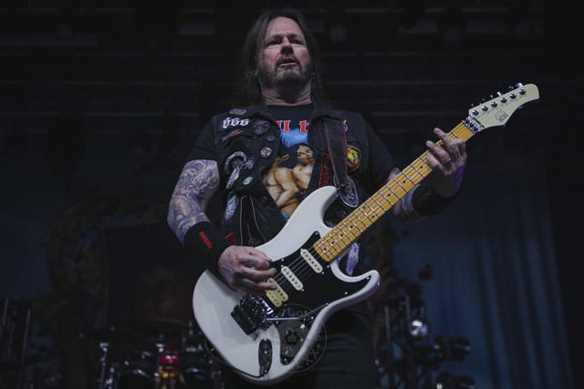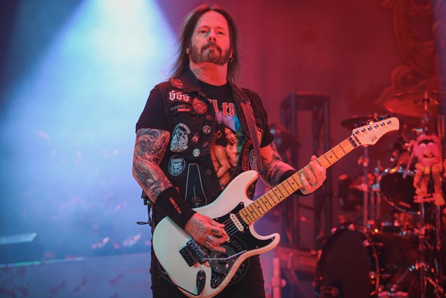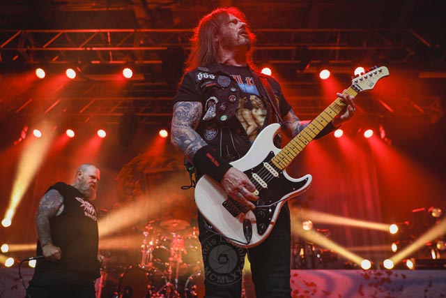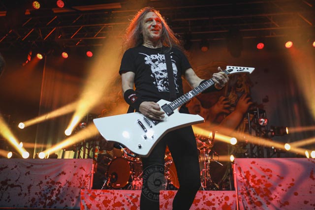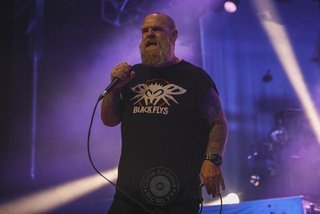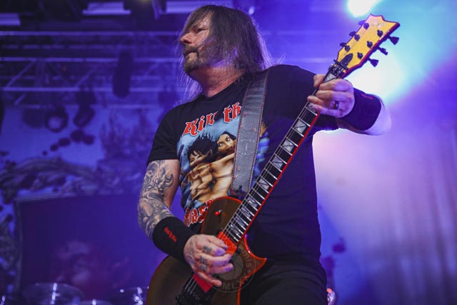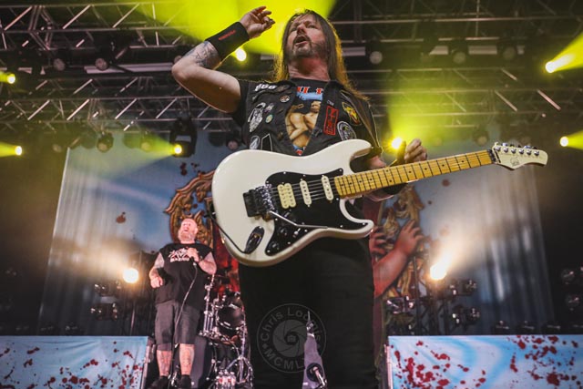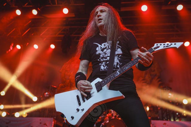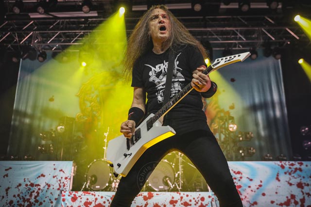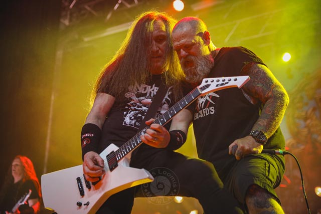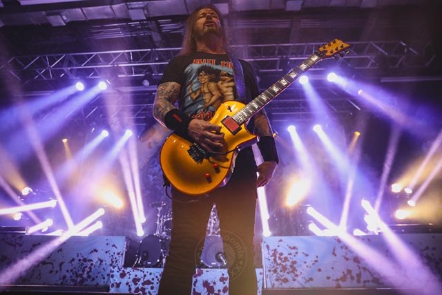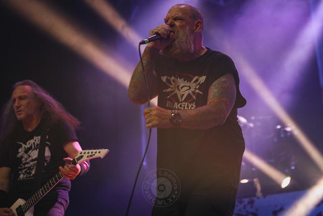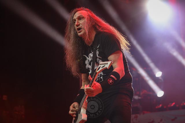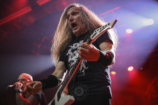 The show kicked off at 9:45 pm, and a five-minute audio of Paul Baloff’s onstage banter played over the PA in honor of the original vocalist. The band then exploded onto the stage, opening with “Bonded by Blood,” and played the first five songs from that album to start the night. This was Rob Duke’s third show since re-joining Exodus and WOW, he is ferocious. Gary Holt played the first two songs with a re-built white Hondo Super Strat as a nod to the one he played back in the beginning of Exodus in the early 80’s. Holt remains one of the top-tier riff masters in thrash metal, as his tone is just crushing, especially on the newer songs. You could tell Holt was pumped up for this show as he was quite active onstage in between his riffing and solos.