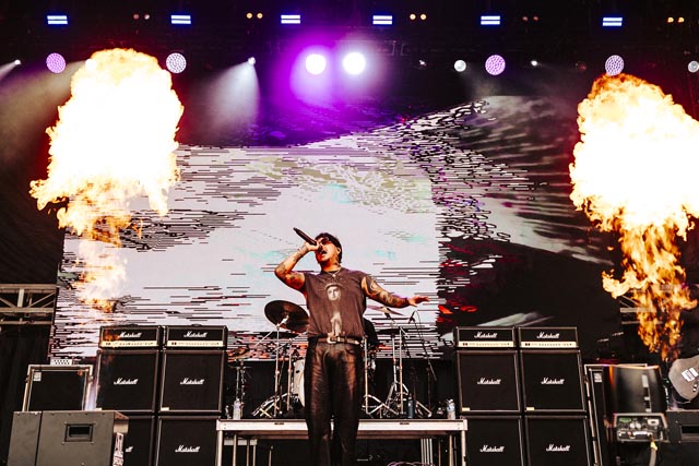 The emotional weight of the day kicked in as I Prevail took the stage, as part of the  Summer of Loud Tour. This was their first time performing since officially parting ways with vocalist Brian Burkheiser. The absence was felt but not dwelled upon. The band turned their set into a tribute—specifically honoring longtime agent Dave Shapiro, who recently passed away in a tragic accident. The pyro was relentless, but so was the emotion. Vocalist Eric Vanlerberghe choked up mid-set, eyes gleaming as flames lit up the stage behind him.