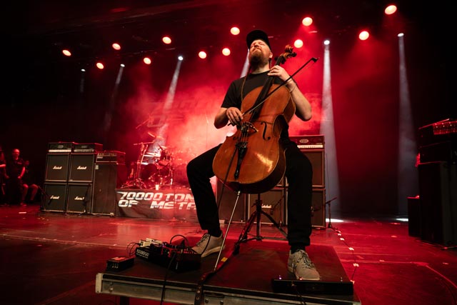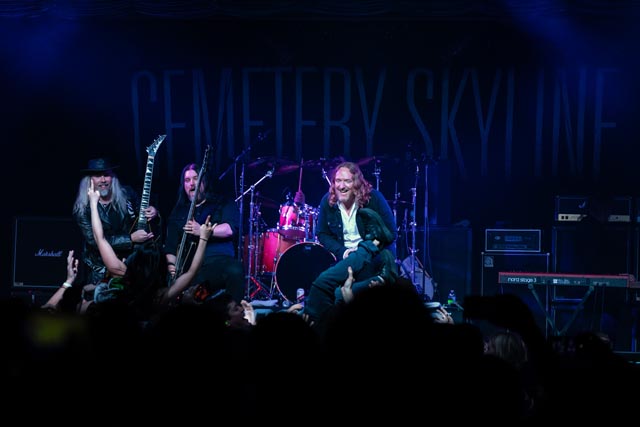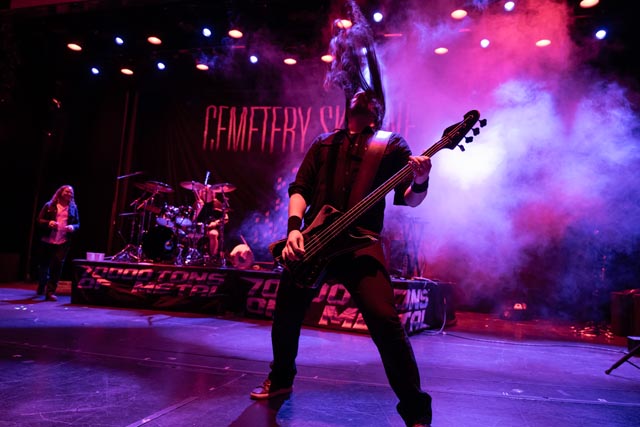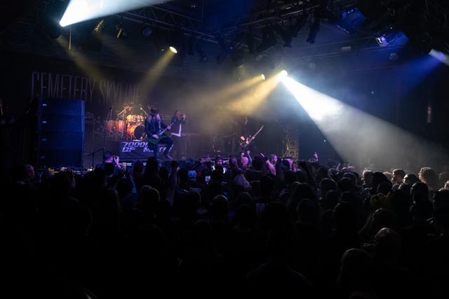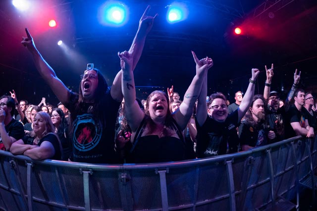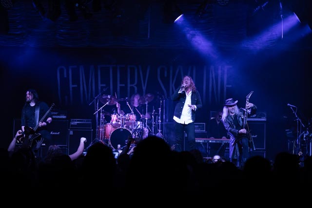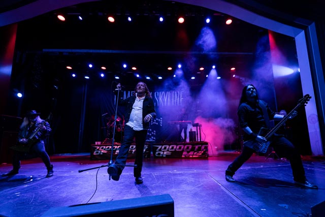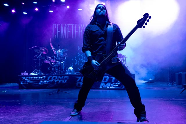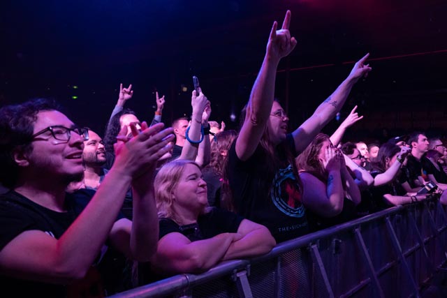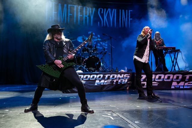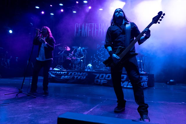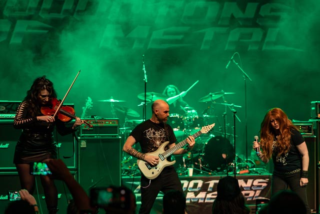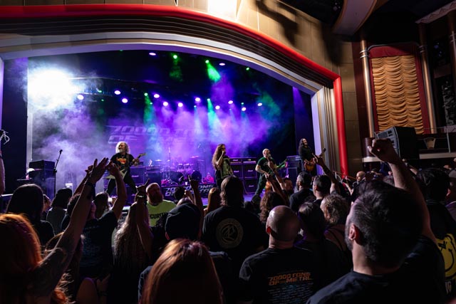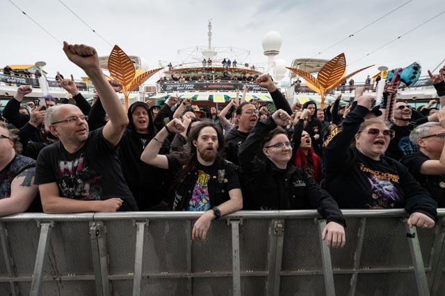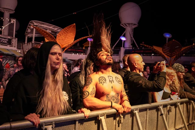Despite the gloomy weather, spirits were high, and sailors were packing the halls on Day 1, mingling with friends, exploring the promenade, and getting ready for the uniquely surreal experience of heavy metal at sea. Seven Spires set the tone for the weekend in the packed Star Lounge, with a setlist that spanned their discography as the ship swayed in the stormy water. Down in Studio B, Harakiri for the Sky delivered an emotionally charged, cathartic performance to enraptured fans. Soen filled the Royal Theater with their somber progressive music, contrasted by their obvious fun the entire time they’re on the stage. Cemetery Skyline played their first set in Studio B, noting that they only have a few songs out so far, and playing most of them, including their newest single, along with a cover of “I Drove All Night” that had the whole room singing along. Following this, Týr picked the energy back up with a set of heavy metal and plenty of hammers. Next up in Studio B was Kanonenfieber, who have rarely played outside of Europe and never in the US, so for many people this was our first chance to see their show live. They brought relentless intensity and a very poignant take on the realities of war through their carefully choreographed stage performance. My final set before heading to bed was Amorphis, with their melancholic tunes filling the Royal Theater, creating the perfect slowdown for my night.