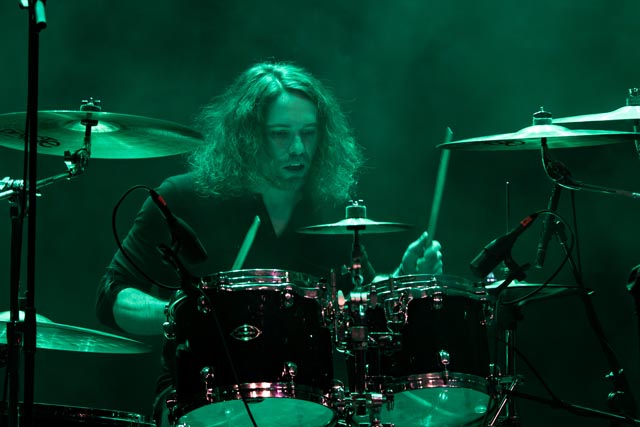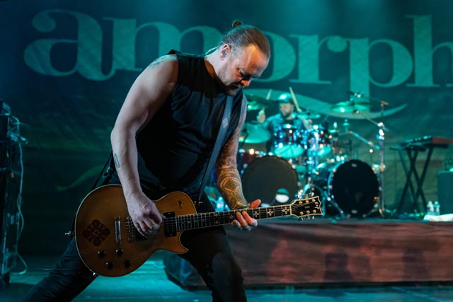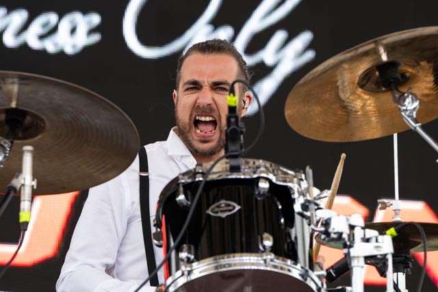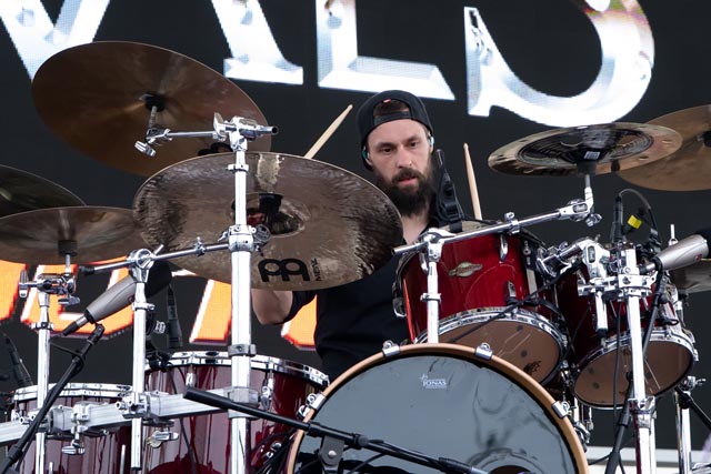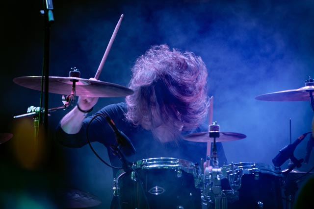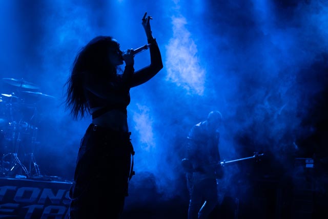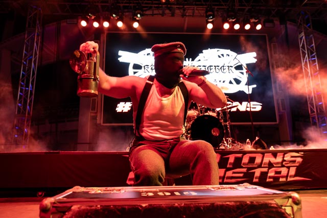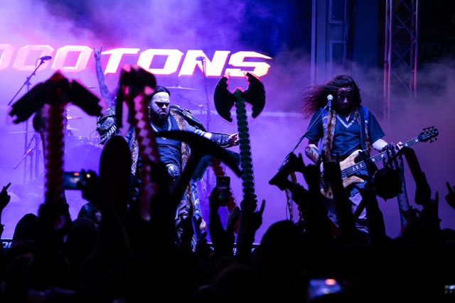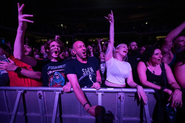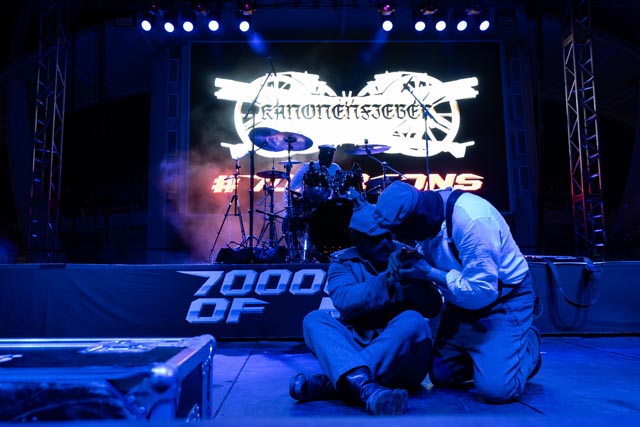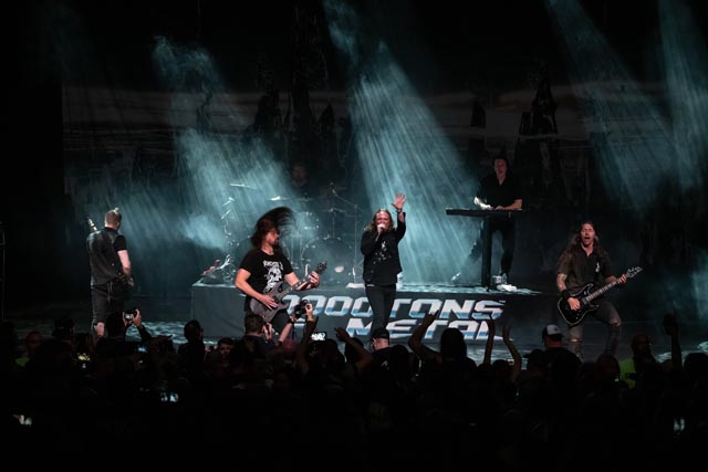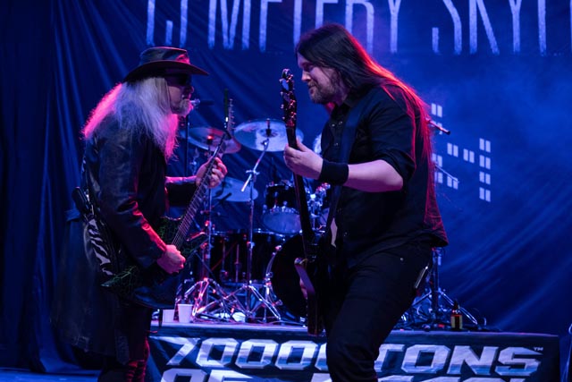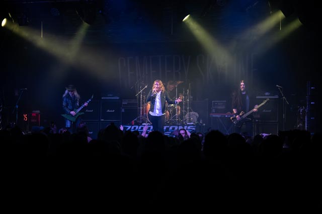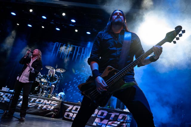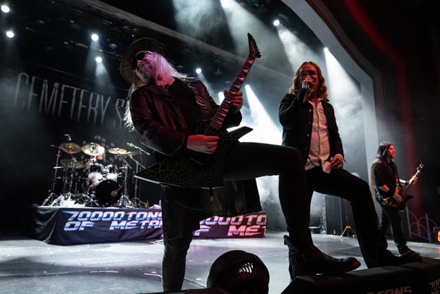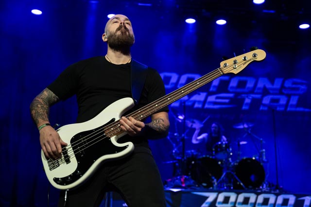 Despite the gloomy weather, spirits were high, and sailors were packing the halls on Day 1, mingling with friends, exploring the promenade, and getting ready for the uniquely surreal experience of heavy metal at sea. Seven Spires set the tone for the weekend in the packed Star Lounge, with a setlist that spanned their discography as the ship swayed in the stormy water. Down in Studio B, Harakiri for the Sky delivered an emotionally charged, cathartic performance to enraptured fans. Soen filled the Royal Theater with their somber progressive music, contrasted by their obvious fun the entire time they’re on the stage. Cemetery Skyline played their first set in Studio B, noting that they only have a few songs out so far, and playing most of them, including their newest single, along with a cover of “I Drove All Night” that had the whole room singing along. Following this, Týr picked the energy back up with a set of heavy metal and plenty of hammers. Next up in Studio B was Kanonenfieber, who have rarely played outside of Europe and never in the US, so for many people this was our first chance to see their show live. They brought relentless intensity and a very poignant take on the realities of war through their carefully choreographed stage performance. My final set before heading to bed was Amorphis, with their melancholic tunes filling the Royal Theater, creating the perfect slowdown for my night.