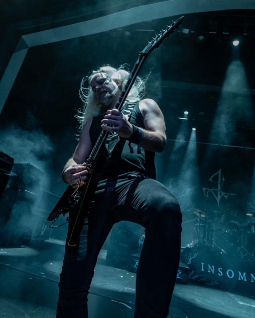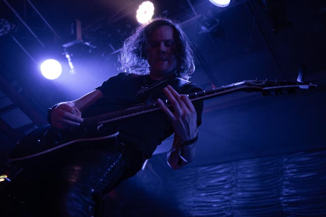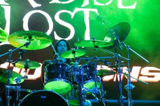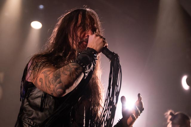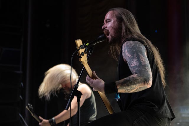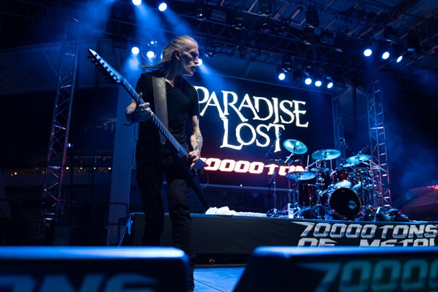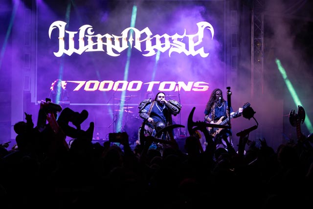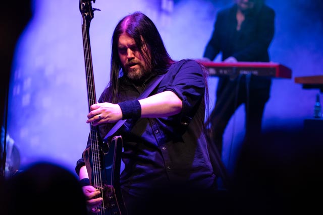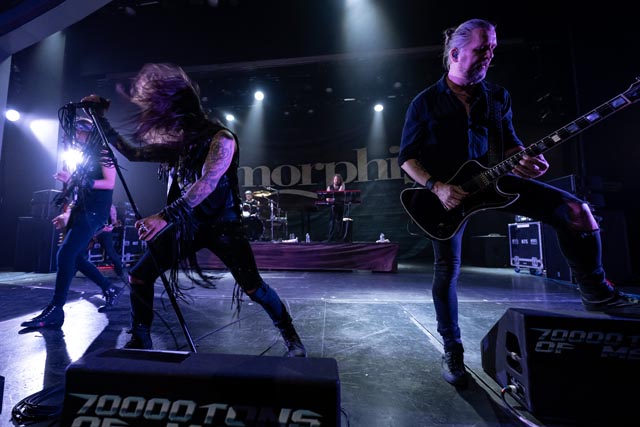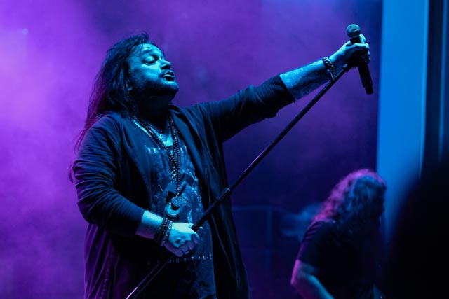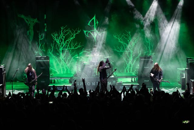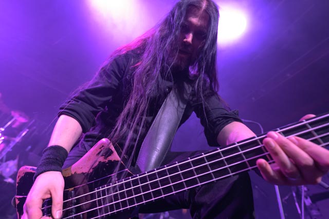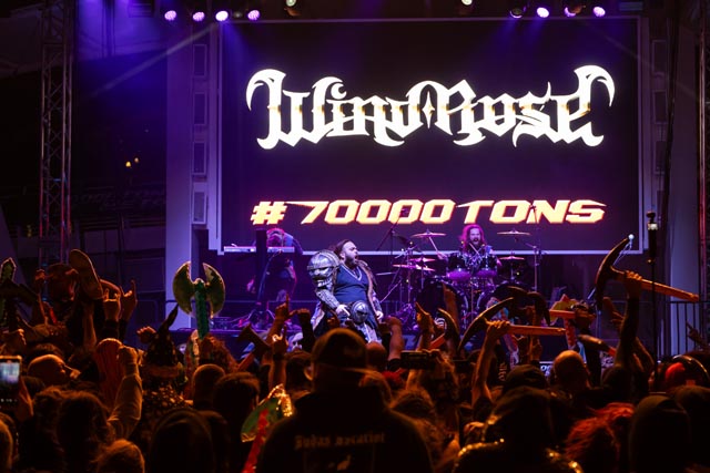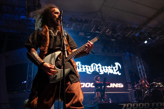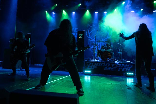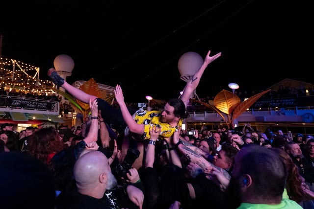 After this, I headed down to Studio B to see Tribulation, who put on a killer show of gothic and doom metal while giving post-punk vibes with their outfits, makeup, and mannerisms. I headed back up to the Pool Deck to see more gothic/doom metal from Paradise Lost. The atmosphere was perfect for the band, with a light mist under the full moon creating a dreary vibe, but the band still apologized for bringing the British weather to the Caribbean with them. After running down to the Royal Theater to catch Dark Tranquility play songs off of two of their most popular albums, The Gallery and Character, I headed back to the Pool Deck to catch a bit of Wind Rose’s set. Despite the gloomy weather, the crowd was rambunctious, so much so that the Pool Deck stage had to be closed briefly after their set for the crew to reset the floor tiles, which had come loose from the crowd’s jumping! Then I made my way back to the Royal Theater to see Insomnium playing Shadows of a Dying Sun in full. With the play through of this fan-favorite album, the theater was completely packed full of people singing, dancing, and otherwise expressing the deep feelings brought out by Insomnium’s melancholy expression of the human condition.