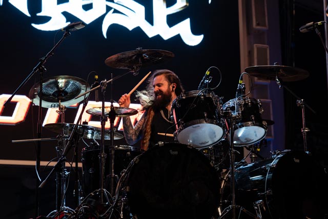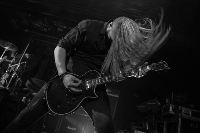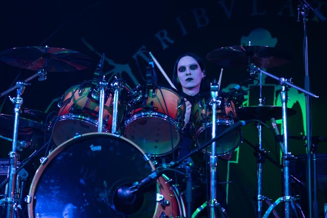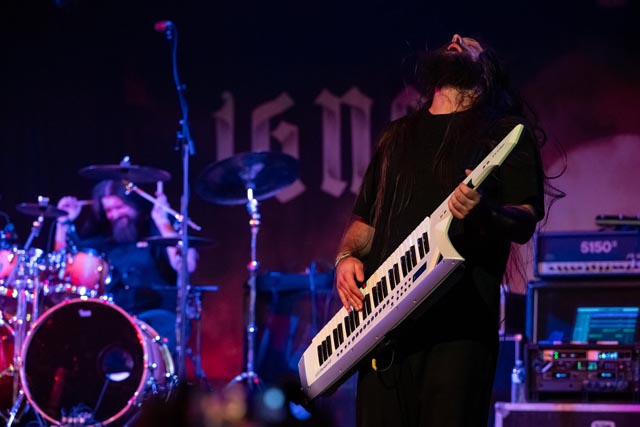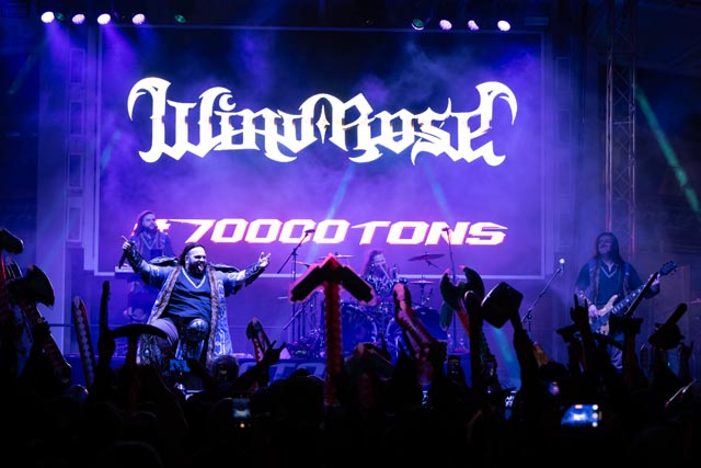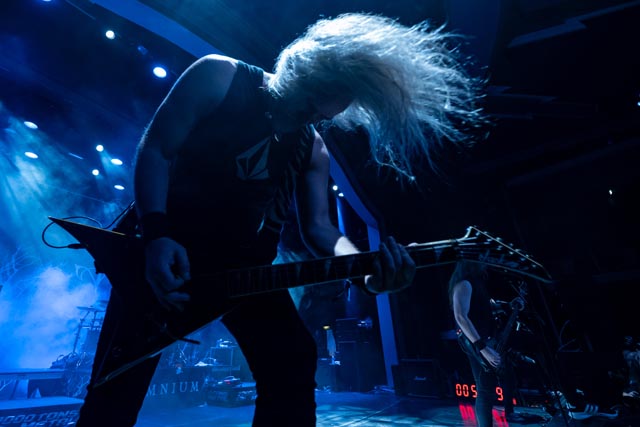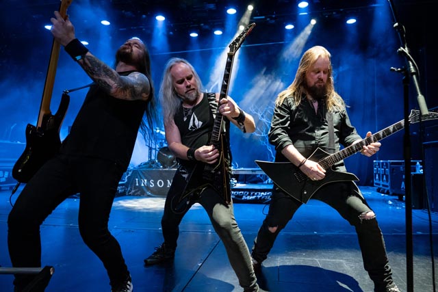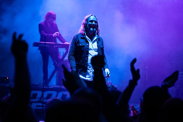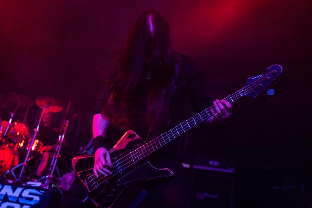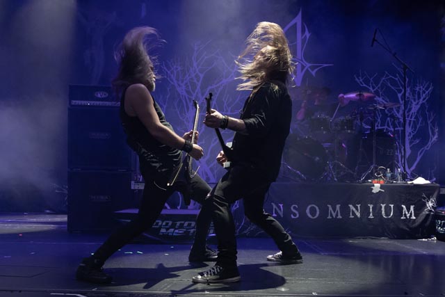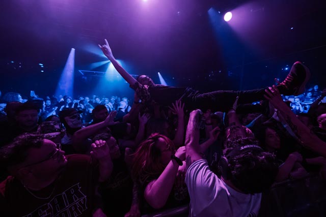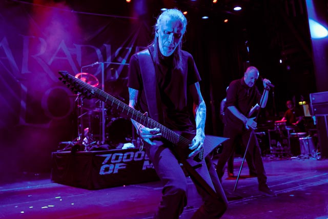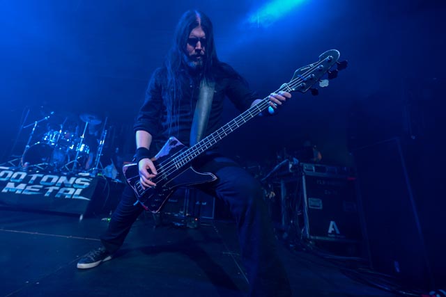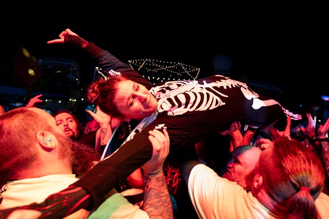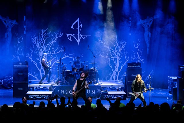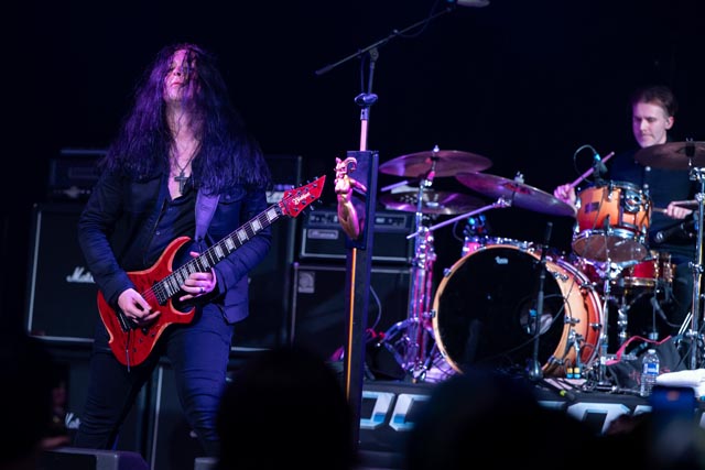 After this, I headed down to Studio B to see Tribulation, who put on a killer show of gothic and doom metal while giving post-punk vibes with their outfits, makeup, and mannerisms. I headed back up to the Pool Deck to see more gothic/doom metal from Paradise Lost. The atmosphere was perfect for the band, with a light mist under the full moon creating a dreary vibe, but the band still apologized for bringing the British weather to the Caribbean with them. After running down to the Royal Theater to catch Dark Tranquility play songs off of two of their most popular albums, The Gallery and Character, I headed back to the Pool Deck to catch a bit of Wind Rose’s set. Despite the gloomy weather, the crowd was rambunctious, so much so that the Pool Deck stage had to be closed briefly after their set for the crew to reset the floor tiles, which had come loose from the crowd’s jumping! Then I made my way back to the Royal Theater to see Insomnium playing Shadows of a Dying Sun in full. With the play through of this fan-favorite album, the theater was completely packed full of people singing, dancing, and otherwise expressing the deep feelings brought out by Insomnium’s melancholy expression of the human condition.