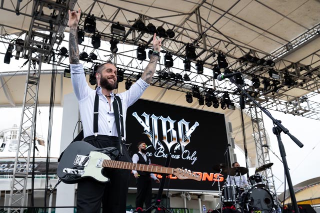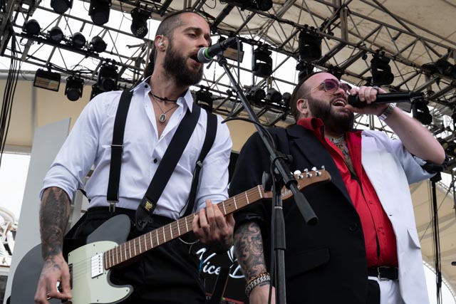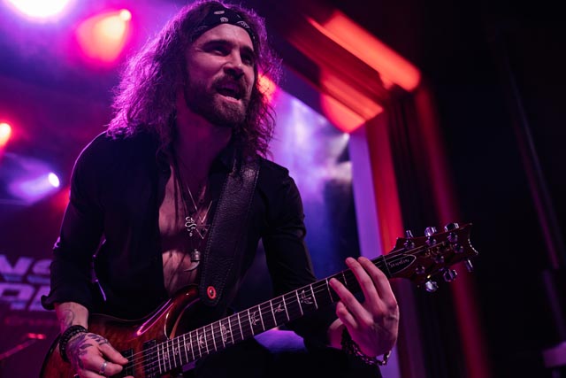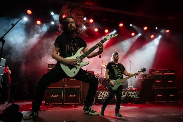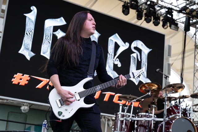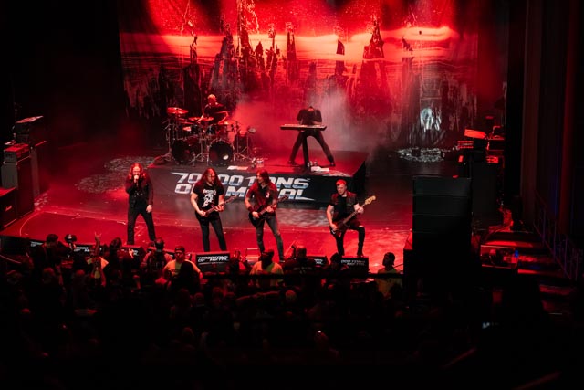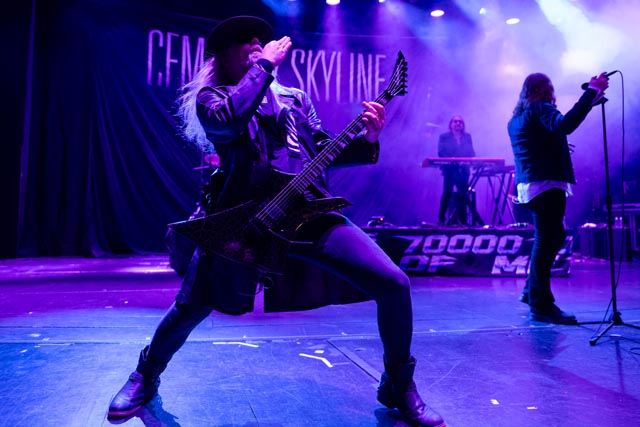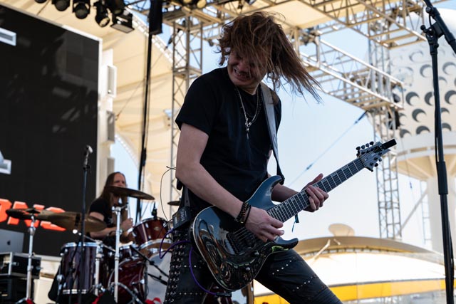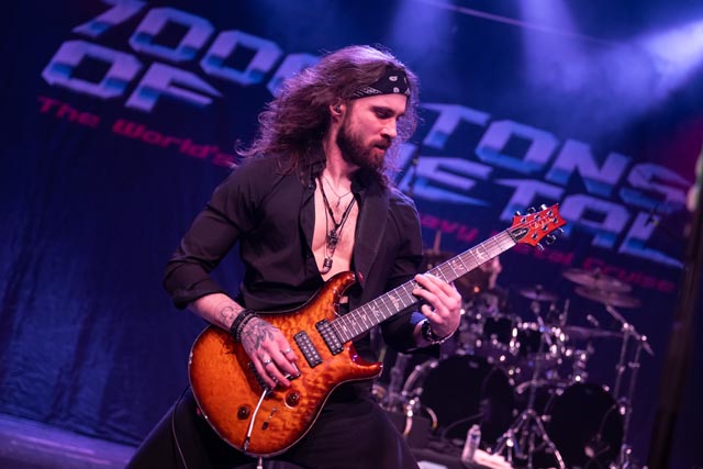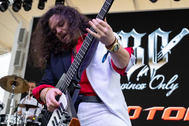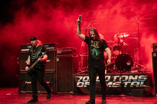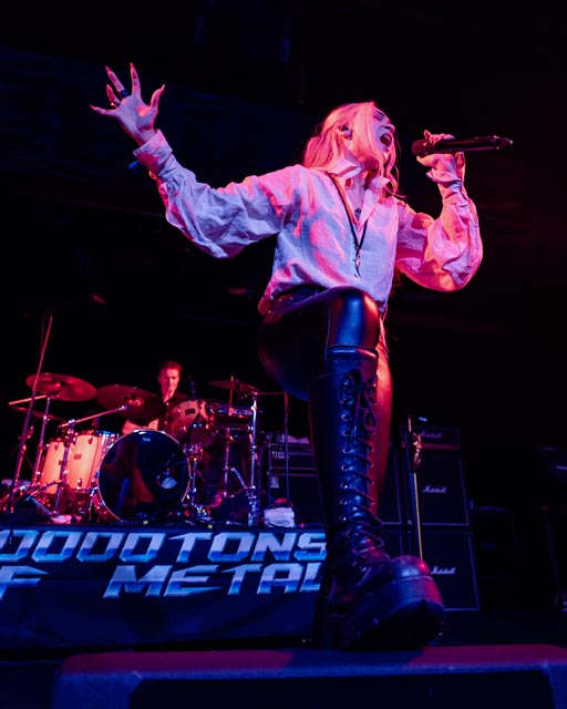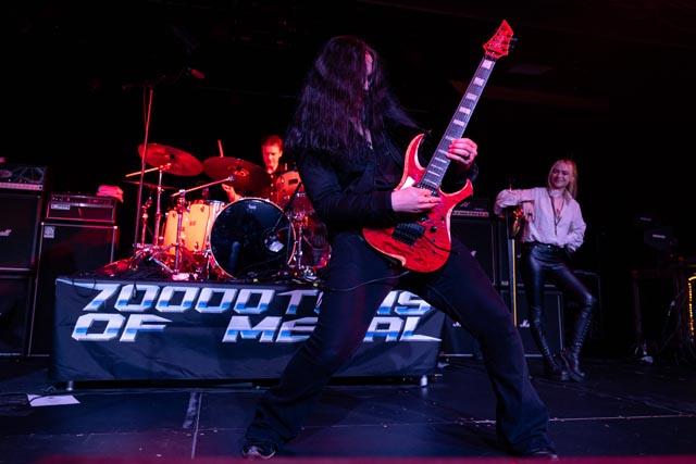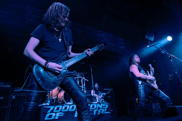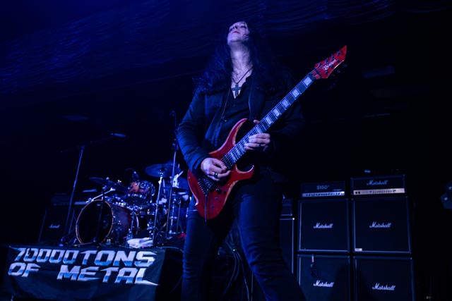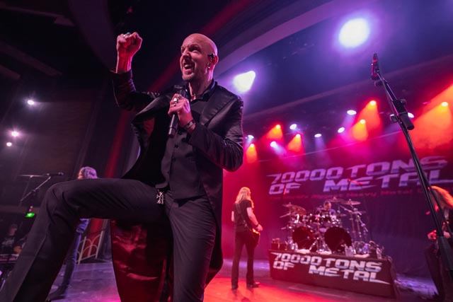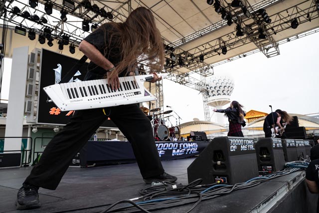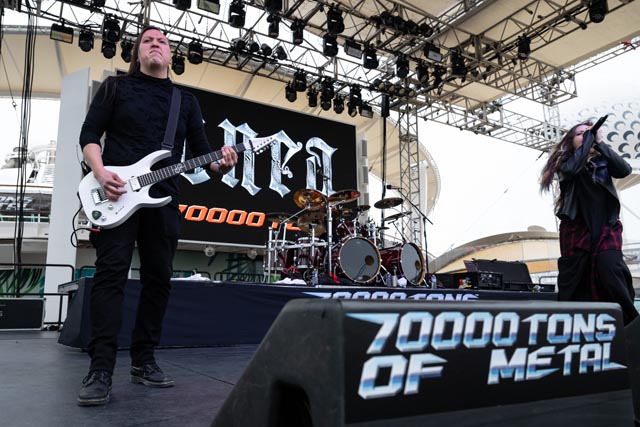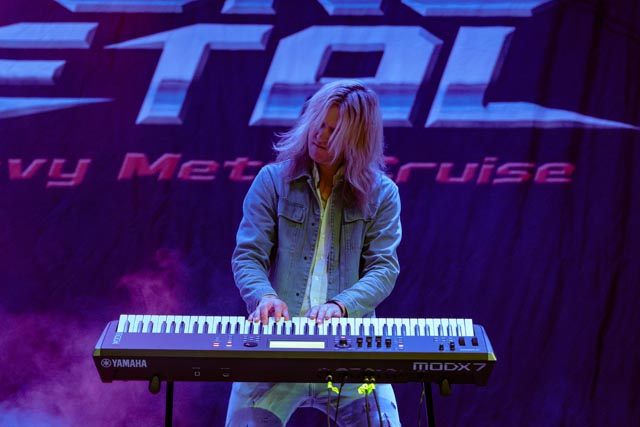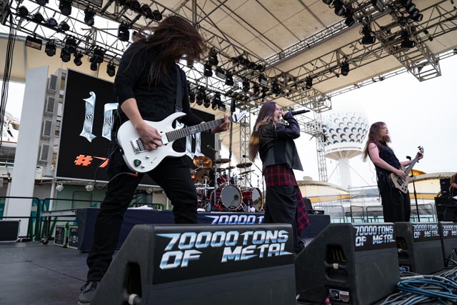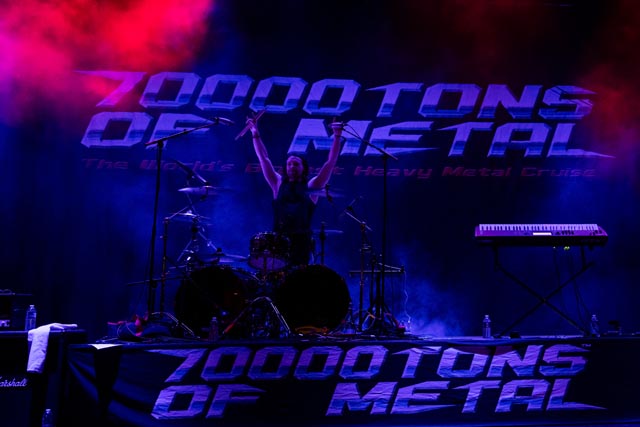 Despite not getting to bed until around 6 am, I made it back up to the Pool Deck stage at 10 am to see Hiraes kick off Day 3 with a very energetic set. Vocalist Britta Görtz talked about her previous voyage on 70K, when she played with Cripper on 70 K’s first voyage in 2011, mentioning how few women musicians were on board in 2011 versus how many were on in 2026 and how she was so excited to see metal becoming a safer and more comfortable place for women in the industry. Next up on the Pool Deck was the debut of VBO, a synthwave band conceived by Francesco Cavalieri of Wind Rose and electronic producer Simone Giusti. It is definitely unusual for 70K to book a band with no released music, especially to play on the Pool Deck, but they brought their A-game and got the crowd jumping and having fun.