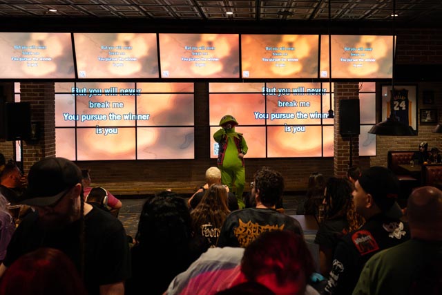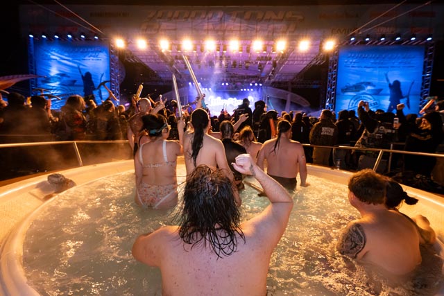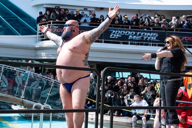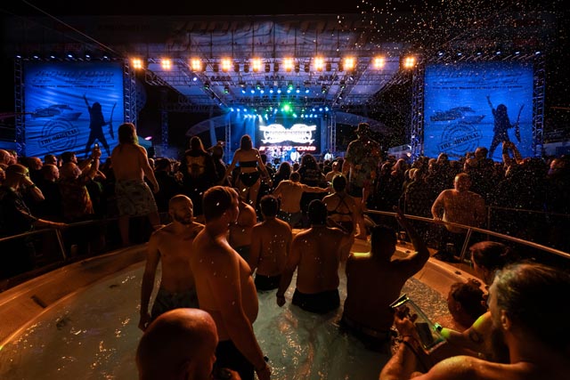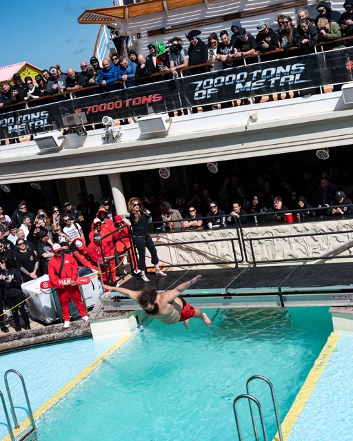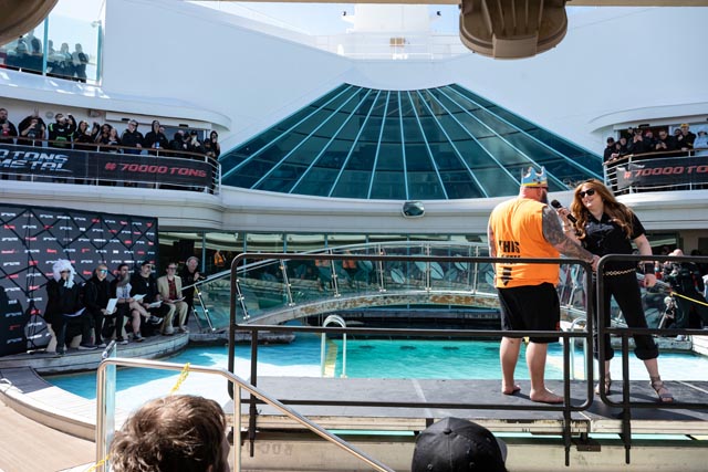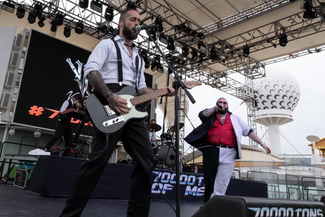 One of the best parts of Day 4 on 70K is the costumes that can be seen across the ship, and one of the best places to see them is on the final night of karaoke. This year, due to the temperatures, the karaoke moved from its usual final day location in the Solarium to remaining in Playmakers, where it can be found on the first 3 nights. Some highlights included a group of men dressed as “70000tons of Maintenance” workers (who, if you asked them to fix anything would just reply “SOON.”) singing “YMCA,” (The Village People) a disturbingly accurate Kermit-voice rendition of “Say Just Words” (Paradise Lost), and the rowdy mosh pits and crowd surfing that broke out during “Full Moon” (Sonata Arctica) and “Te Quiero Puta” (Rammstein).