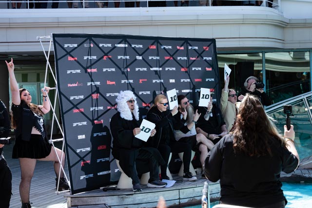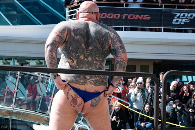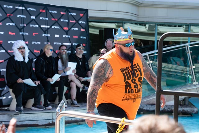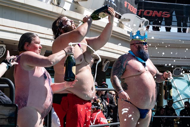 Despite the brief improvement in weather, it was still a bit chilly, which meant fewer competitors in the annual Belly Flop Contest, which challenges sailors to bring their best flop into the Solarium pool. The contest was hosted by Kim Dylla and judged by a panel of artist judges, including Sean Tibbets from Kamelot in full judge regalia. Silver (IL), the reigning champion from 2025, took home the crown again, after a multi-part striptease that took him from a tank top and shorts down to a tiny thong Speedo by his final flop. He got a perfect score in the first round (with Sean Tibbets actually holding up an extra card to rate him 11) and another perfect score in round 2. Second and third place were hotly contested, but ended with Josh (FL) taking home second place and Leah (WI) in third, the first woman to ever make it to the finals at the 70K Belly Flop Contest.