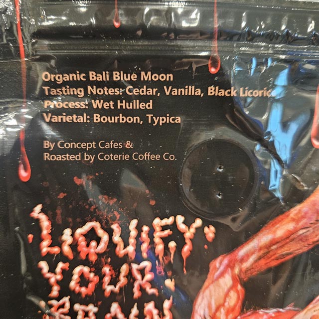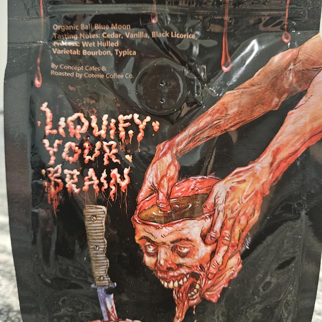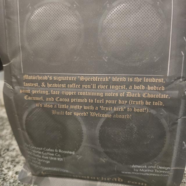 One standout feature is the flexibility in how you want your beans: Whole Bean, Drip, Coarse, Espresso, Percolator, or Ground. Coming from a household that runs on a classic Mr. Coffee setup, we went with Ground and sampled three roasts: Cannibal Corpse – “Beheading & Brewing’ Coffee: Bali Blue Moon,” Motörhead – “Speedfreak,” and GWAR -“Berserker Mode.” As a daily coffee drinker who usually rotates between Costa Rica blends at Sprouts, Tim Hortons at Publix, or whatever Starbucks or Dunkin’ location is wedged between Florida’s endless food chains and roundabouts, I have to say that these coffees deliver. All three were sampled black to experience their raw, full-bodied flavor. But first, let’s talk packaging.