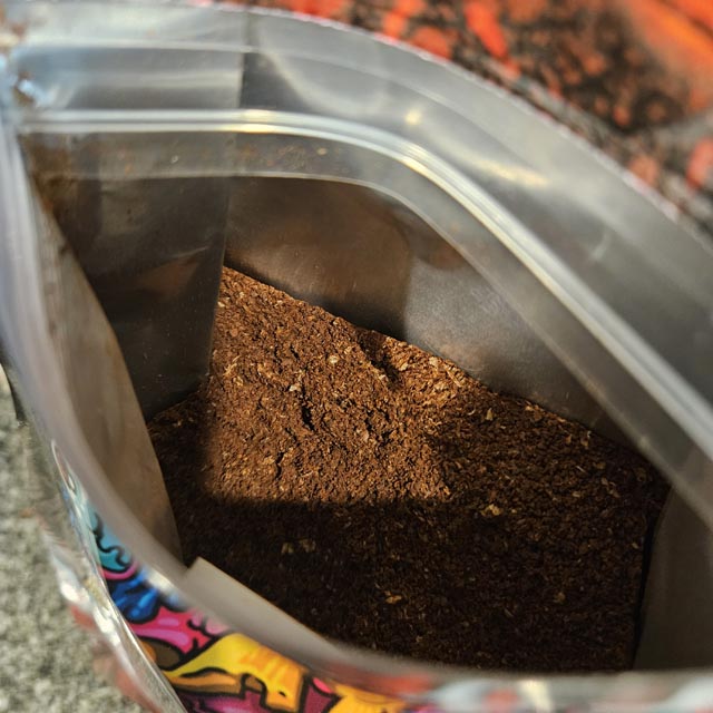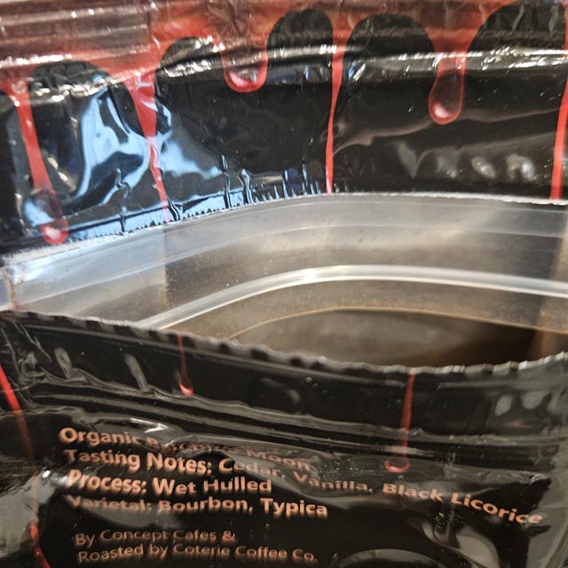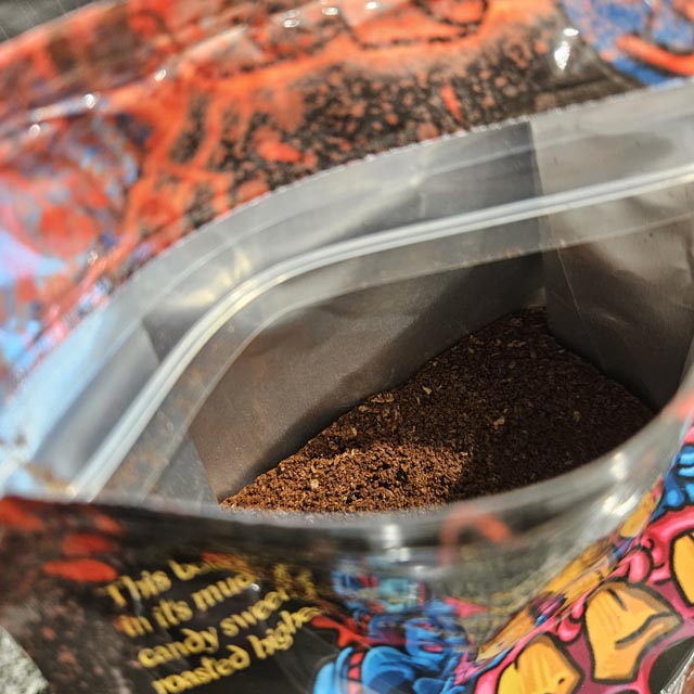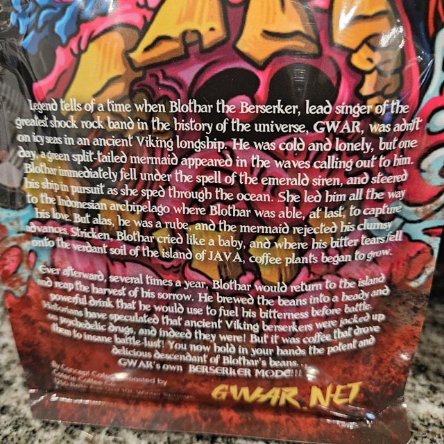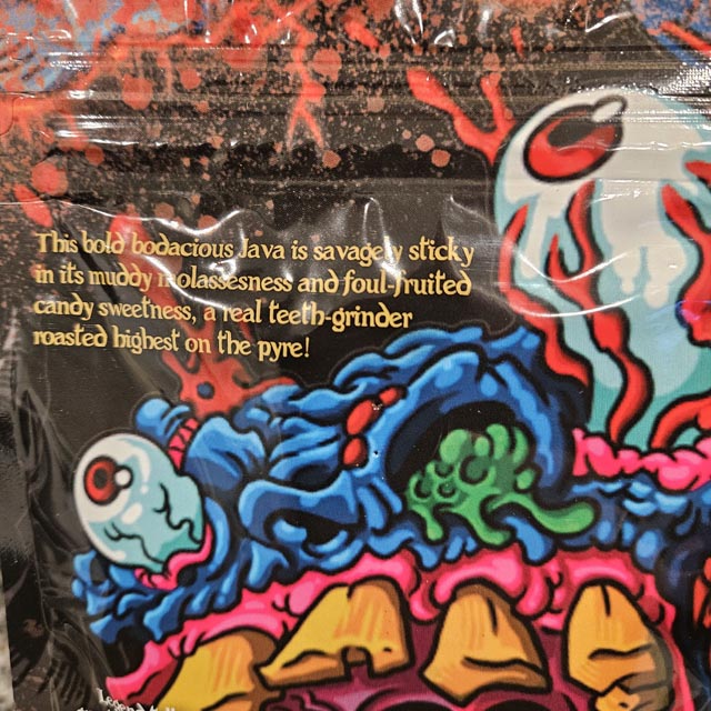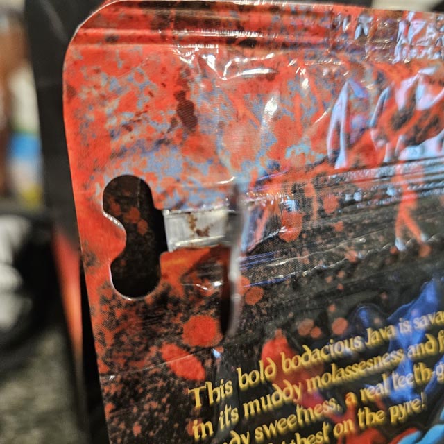 Unhinged, chaotic, and gloriously over-the-top, just like the band. Strong packaging with berserker-level art. You already know this coffee is going to be loud before you even open it. Each bag had a handy resealable lever in the back, making it easy to store and keeping the grounds fresh without tearing up the package. Nice touch.