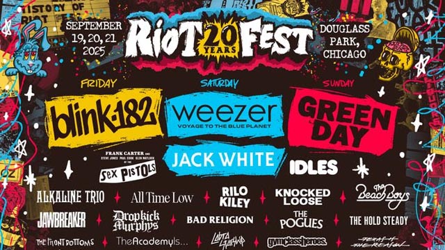 Riot Fest celebrates its 20th anniversary with a stacked 2025 lineup featuring headliners Green Day, Blink-182, Weezer, Jack White, and the Sex Pistols (featuring Frank Carter, Steve Jones, Paul Cook, and Glen Matlock). The event returns to Chicago’s Douglass...