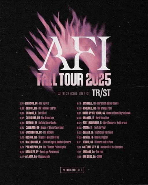 AFI will return to the stage this fall for a 24-date North American headlining tour with special guest TR/ST. Produced by Live Nation, the tour kicks off September 30 in Madison, WI and concludes on November 16 in Mexico City. This marks AFI’s first full-scale tour since the release of 2021’s Bodies. Tickets go on sale this Friday (27th) at 10:00 AM via this location.