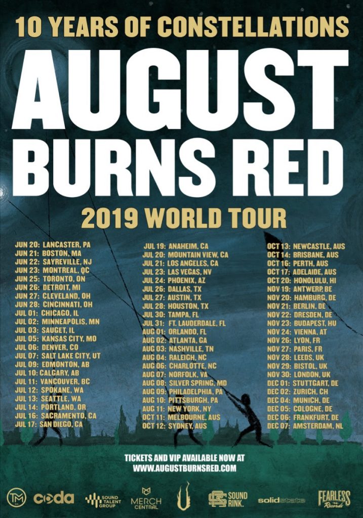 August Burns Red released their overall third studio effort Constellations ten years ago. To celebrate the decade milestone, the group has announced a 10-Year Anniversary World Tour as they plan to play in its entirety. The trek kicks off on June 20th in Lancaster, PA and will run up until December 7th in Amsterdam. The North American leg of the tour will run from June 20th up until August 11th in New York City as Silverstein and Silent Planet will support the North American journey. VIP tickets are available now. However, general tickets will go on sale this Friday (15th) at 10am local time.
