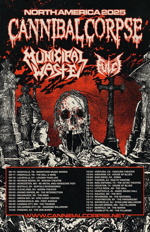 Cannibal Corpse will return to the road this Fall for a headlining North American tour, kicking off September 15 in Nashville and wrapping up October 22 in Charlotte, NC. Support will come from Municipal Waste and Fulci. Tickets go on sale Friday, May 9, at 10:00 am local time.