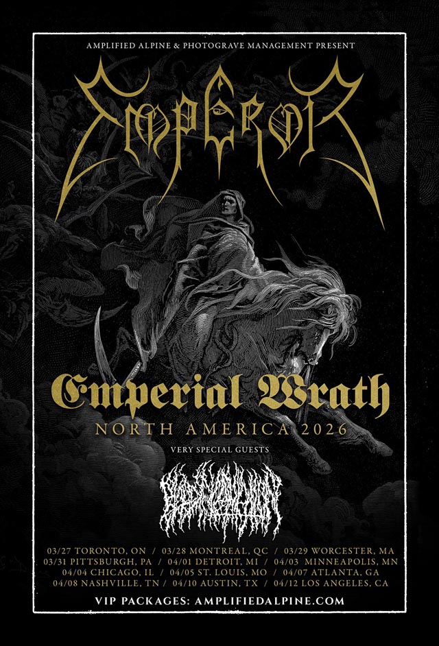 Emperor will return to North America in spring 2026 for their Emperial Wrath headlining tour, marking another rare run from the influential Norwegian black-metal legends. The trek spans through March and April and features direct support from cosmic death-metal outfit Blood Incantation. Tickets and VIP packages go on sale Friday (21st).