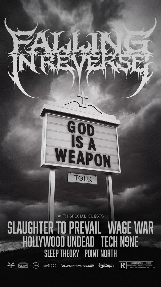 Falling In Reverse are returning to the road this summer for a headlining North American trek. Dubbed, Falling In Reverse: God Is A Weapon Tour, kicks off on August 10th in Denver, CO, and concludes on September 26th in Las Vegas, NV. Support will come from Wage War, Tech N9ne, Sleep Theory, Slaughter To Prevail, Hollywood Undead, and Point North on varying dates listed as followed: