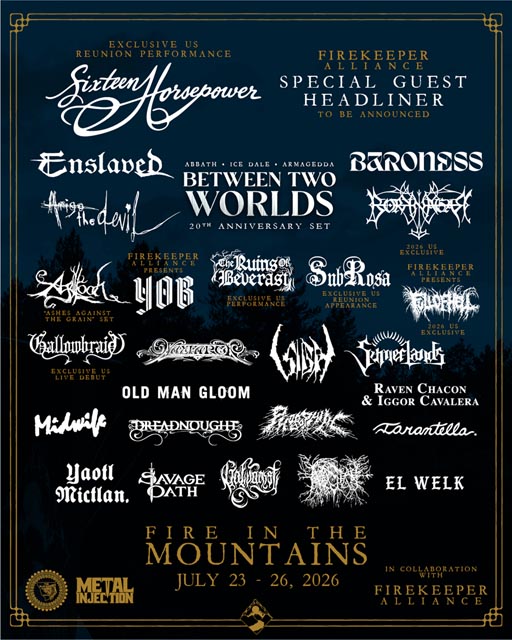 Fire in the Mountains has expanded its 2026 lineup with the addition of Agalloch (performing Ashes Against the Grain), Amigo the Devil, and Between Two Worlds. The festival takes place July 23–26 at Red Eagle Campground in East Glacier, MT, near Glacier National Park on land the Blackfeet Nation call “The Backbone of the World.” A special guest headliner is still to be announced. Tickets are available at this location.