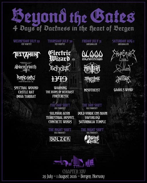 Beyond the Gates has announced the complete 2026 lineup for its July 29–August 1 return to Bergen, featuring newly added Electric Wizard, Blood Incantation, Marduk, Gaahls WYRD, Mortuary Drape, Whoredom Rife, and Terrestrial Hospice alongside headliners Emperor and Testament. Tickets are available at this location.