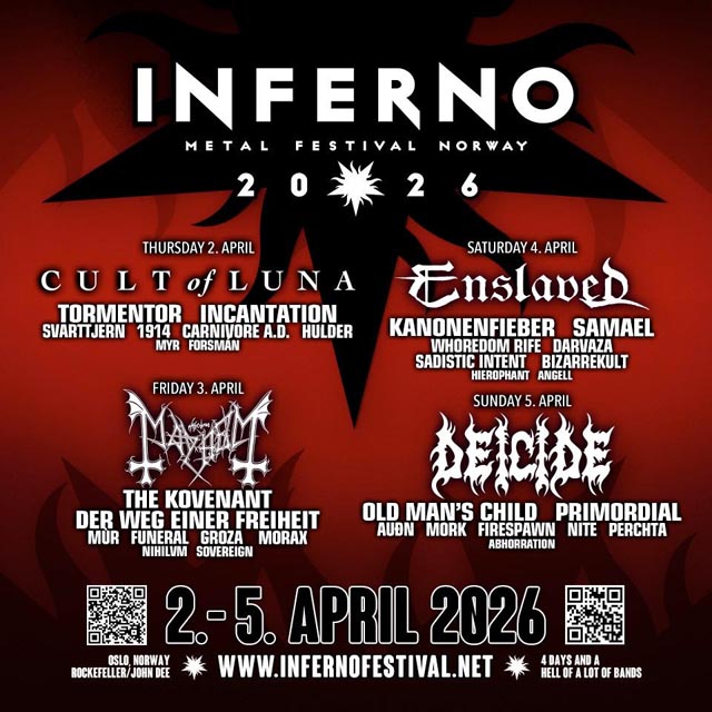 Inferno Metal Festival has revealed its final round of artists for the 2026 edition, taking place April 2–5 across multiple venues in Oslo. Newly added acts include Cult of Luna, Der Weg Einer Freiheit, Svarttjern, 1914, Sadistic Intent, Hulder, Zatokrev, Bizarrekult, Swartheim, Gloombound, Angell, and Raumer. Festival organizers have also shared the Rockefeller and John Dee day splits. Tickets are available at this location.