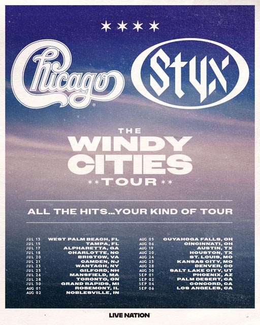 Styx and Chicago are teaming up in 2026 for a Summer North American Tour dubbed, The Windy Cities Tour. Tickets are available at this location.