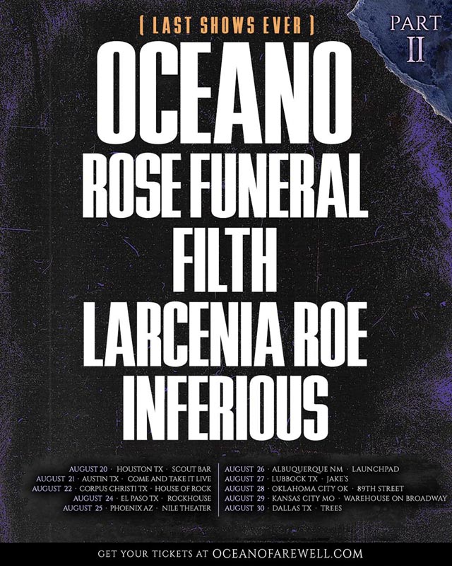 Oceano have announced a second leg of dates for their farewell tour, The Death Oceano. The newly added leg will feature support from Rose Funeral, Filth, LarcɆnia RoɆ, and Inferious. The first leg kicked off yesterday (13th) with support from I Declare War, Escuela Grind, Filth, and Backbiter.