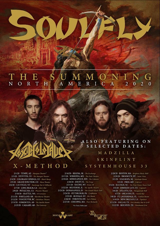 Soulfly will be hitting the road in February for The Summoning North American Tour. This time around, these metal legends will be bringing Toxic Holocaust and X-Method along with them! Additionally, Madzilla, Skinflint and Systemhouse 33 will be joining in on select dates of the trek.