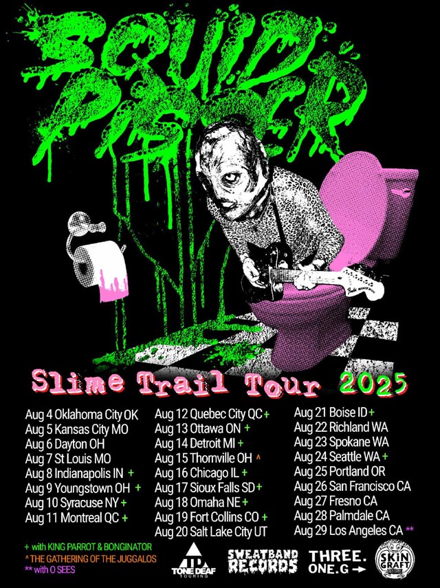 Avant-grind maniacs Squid Pisser will hit the road this August for a full U.S. tour, joining forces with King Parrot and Bonginator for a run of chaotic shows. The trek includes a stop at Gathering of the Juggalos and a finale supporting O Sees in Los Angeles. Fresh off their 2024 full-length Dreams of Puke, Squid Pisser is now back in the studio with producer Toshi Kasai (Melvins, Big Business) working on new material expected to drop soon.