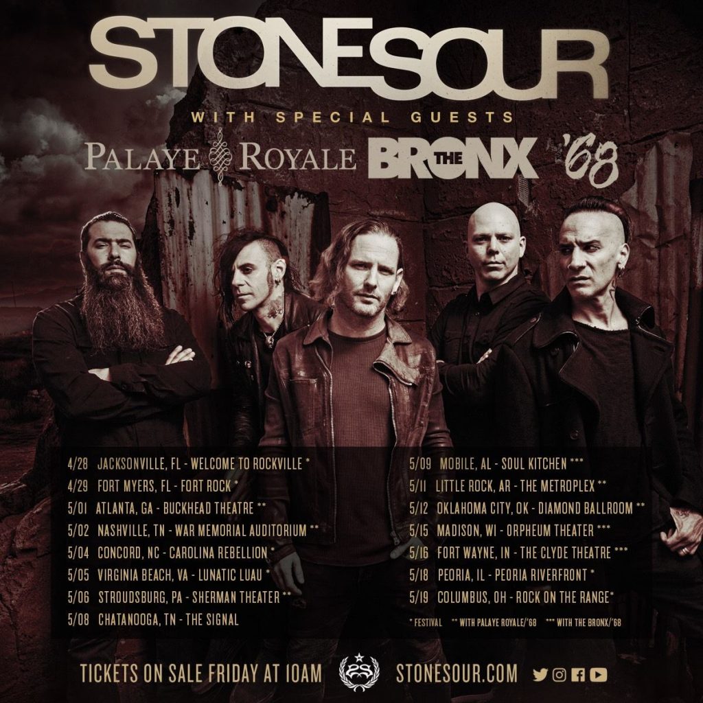 Prior to supporting Ozzy Osbourne’s North American farewell run, Stone Sour have announced a string of headlining dates of their own. The group will continue to promote their latest effort 2017’s Hydrograd and this time around, Palaye Royale, The Bronx and ‘68 will be joining in on support on select dates. The trek begins on April 28th at Welcome to Rockville and concludes on May 19th at Rock On The Range.