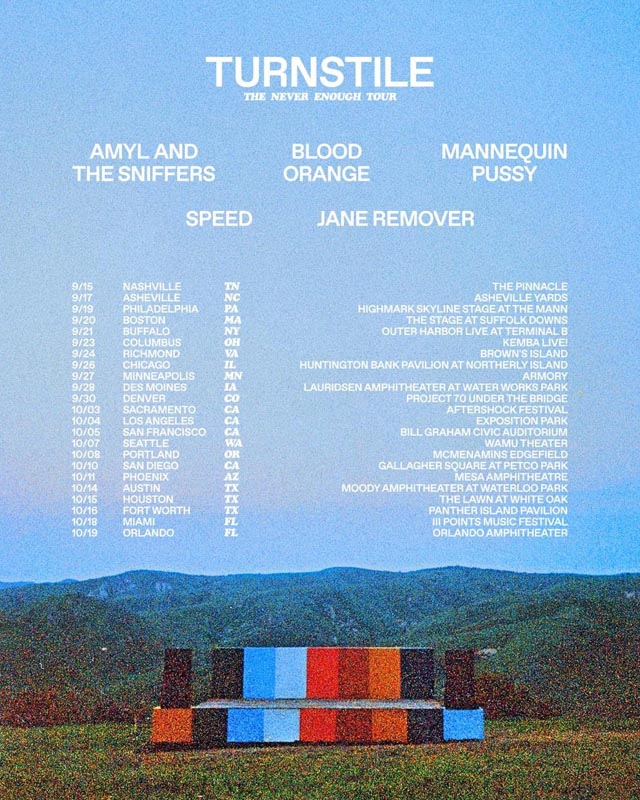 Turnstile will be hitting the road this Fall for their headlining North American The Never Enough Tour. The trek kicks off on September 15, featuring support from Speed and Jane Remover, with Amyl & The Sniffers, Blood Orange, and Mannequin Pussy appearing on select dates. Tickets go on sale this Friday (13th). The announcement follows the release of Turnstile’s new album, Never Enough, along with a companion film, Turnstile: Never Enough, directed by Brendan Yates and Pat McCrory. For tour dates, tickets, and more information, go to this location.