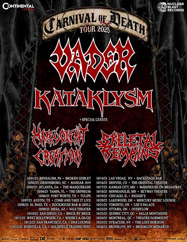 Vader and Kataklysm are teaming up for a fall co-headline North American Tour. Dubbed, Carnival of Death Tour 2025, the trek kicks off on October 1st in Bensalem, PA and concludes on October 26th in Brooklyn, NY. Support will come from Malevolent Creation and Skeletal Remains. Tickets are available at this location.