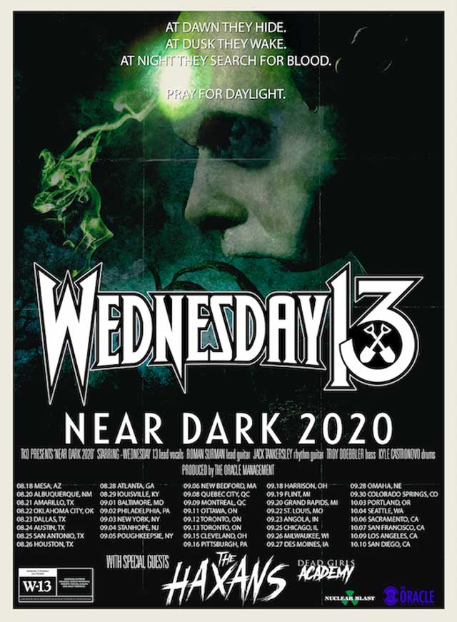 “After two years of doing support slots around the world, the Wednesday 13 ‘Near Dark‘ Headline Tour is finally here! We are SO excited to get back to our headline shows and deliver the most theatrical Wednesday 13 show you’ve ever seen. More spook, more puke, more bang for your fangs….see ya in the Graveyard at Midnight.”