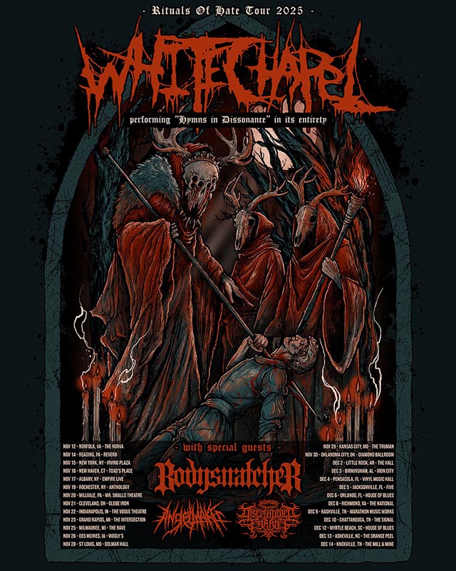 Whitechapel will return to the road this fall for their Rituals Of Hate headlining tour. The trek kicks off on November 12 in Norfolk, VA and runs through December 14 in Knoxville TN. Whitechapel will be performing their new album Hymns In Dissonance in full, along with fan favorites. Support comes from Bodysnatcher, Angelmaker, and Disembodied Tyrant. VIP packages, including meet and greets, exclusive merch, and early access, will be available. Pre-sales begin Wednesday (28) at 10am local time, with general tickets on sale Friday (30) at this location.