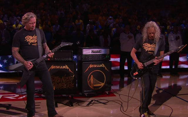 At this point, Metallica are old pros at playing the National Anthem. The two-guitar version of “The Star Spangled Banner” that Kirk Hammett and James Hetfield played last night isn’t that different from the one they’ve played for the past few years during ‘Metallica Day’ for the San Francisco Giants. However, that generally hasn’t happened during a championship game in front of millions of viewers. The two played the song during game 5 of the NBA championship game between the Golden State Warriors and the Cleveland Cavaliers. It proved to help the home team, as the Warriors beat the Cavs. And since the band aren’t playing any more shows until August 1, maybe they’ll actually have some time to work on their next album again.